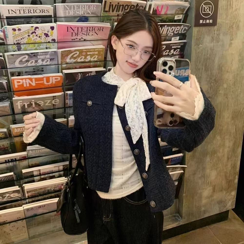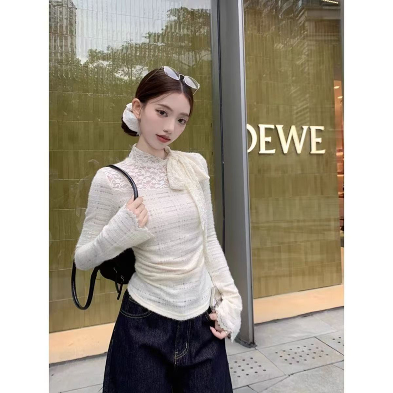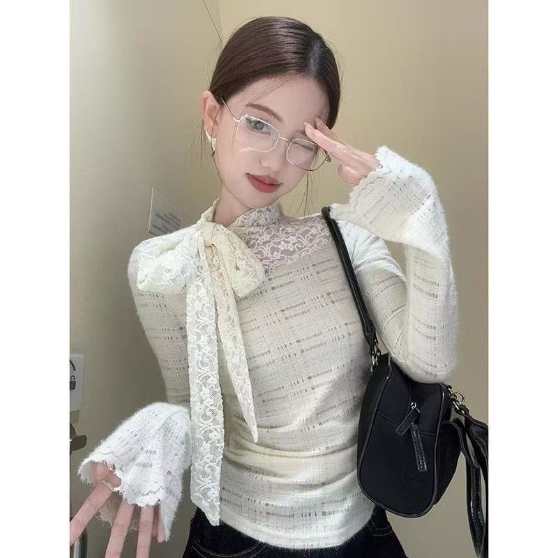YF6240-图片色甜美时尚气质系蝴蝶结长袖半高领提花设计弹力修身蕾丝衫