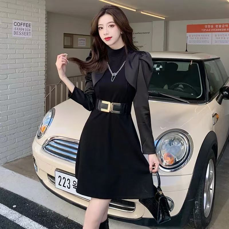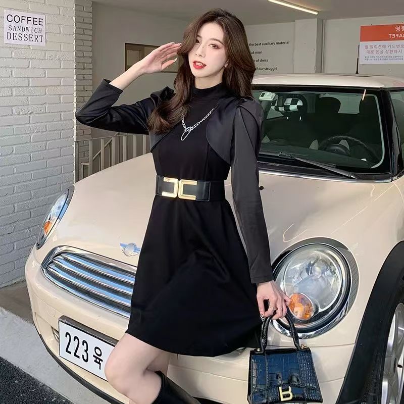 YF6244-图片色优雅时尚假两件拼接褶折长袖高领系扣修腰显瘦设计连衣裙