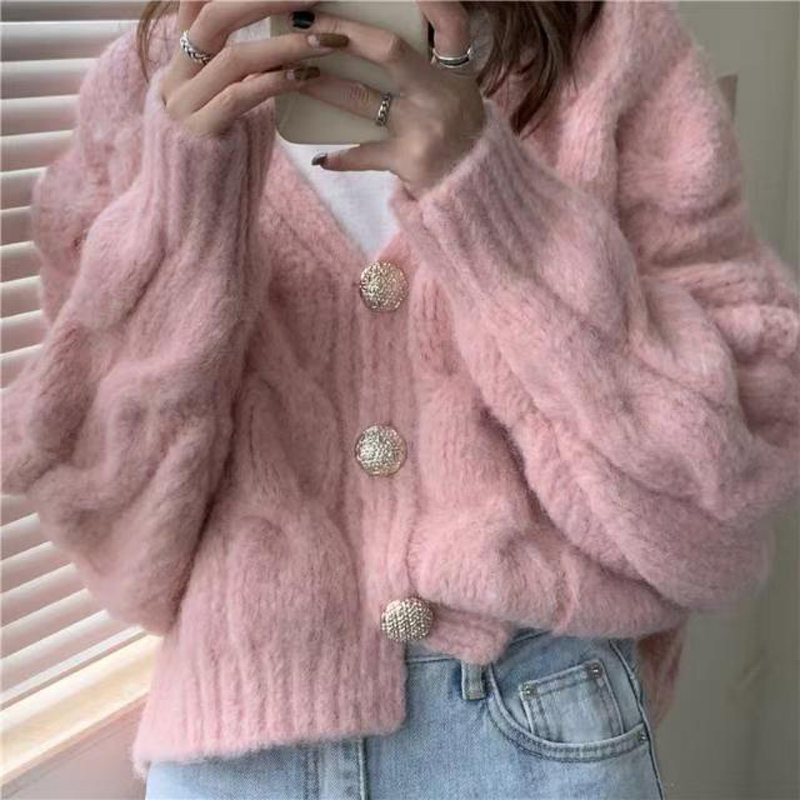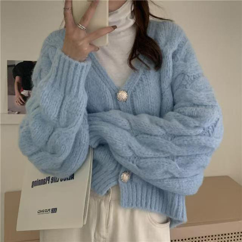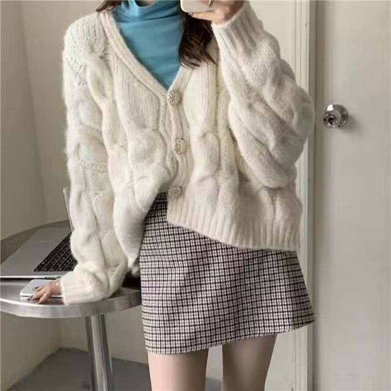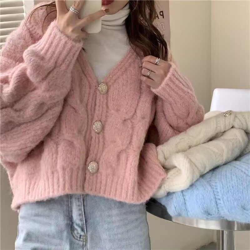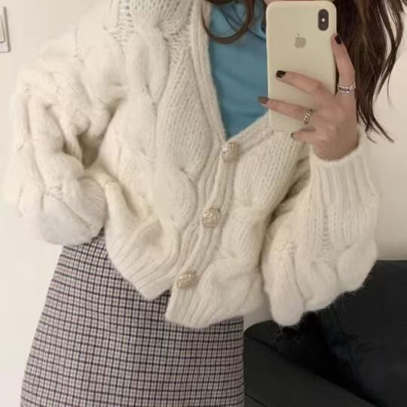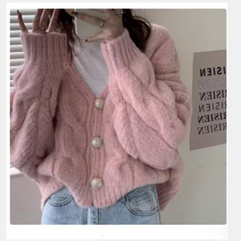 YF6248-(3色入内)冬季长袖V领系扣麻花编织短款加厚大码显瘦针织开衫外套