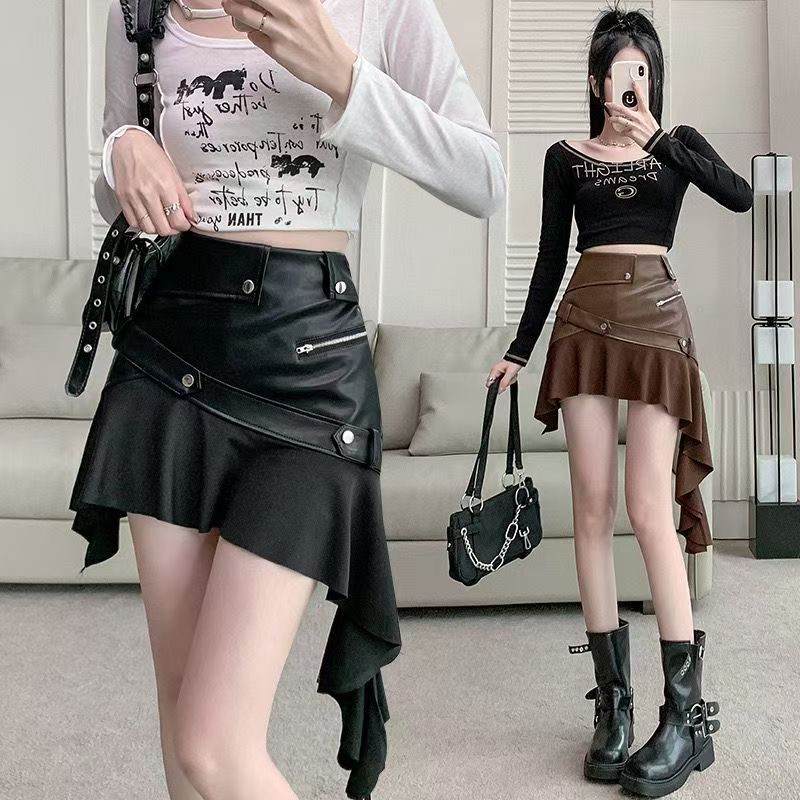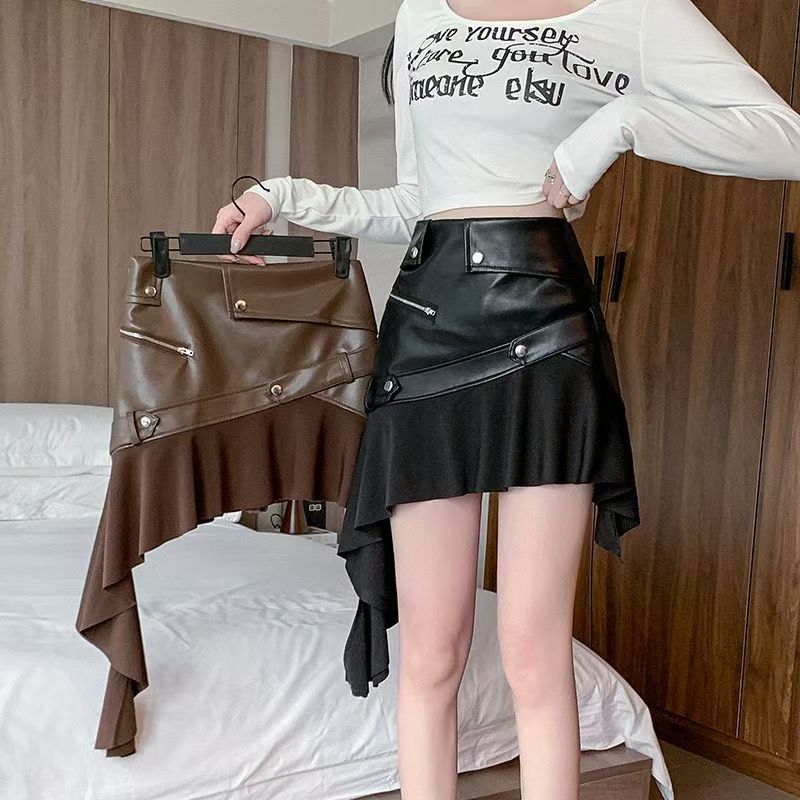 YF6252-(2色入内)性感时尚不规则飘带设计PU皮拉链口袋拼接褶折半身