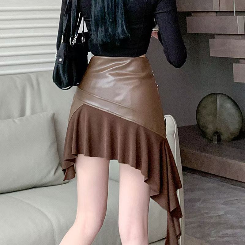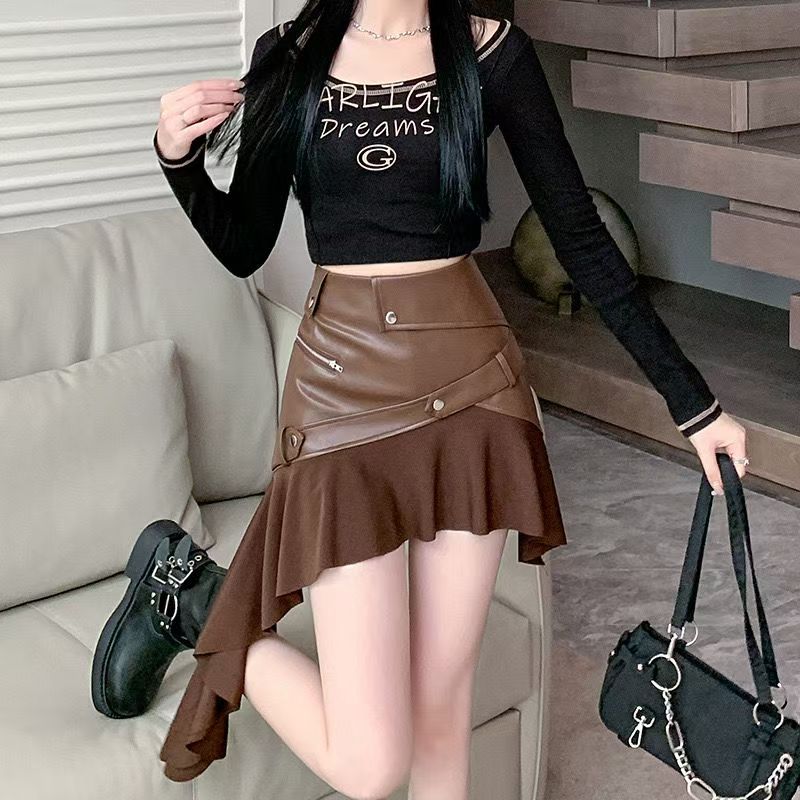 YF6252-(2色入内)性感时尚不规则飘带设计PU皮拉链口袋拼接褶折半身裙