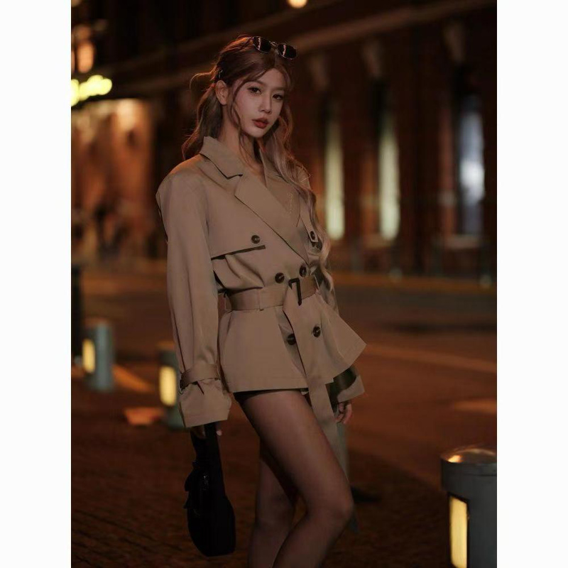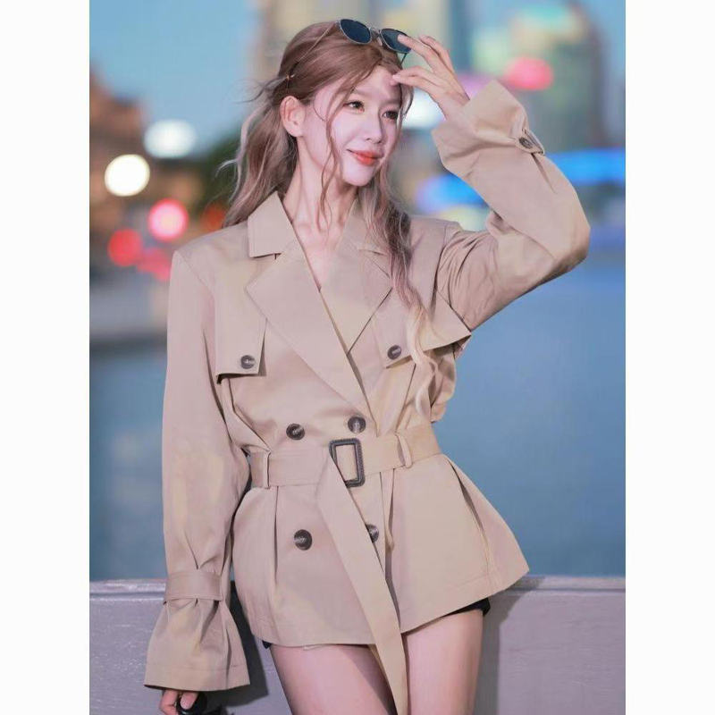 YF6262-图片色英伦风长袖翻领双排扣系腰带卡其色短款休闲风衣外套