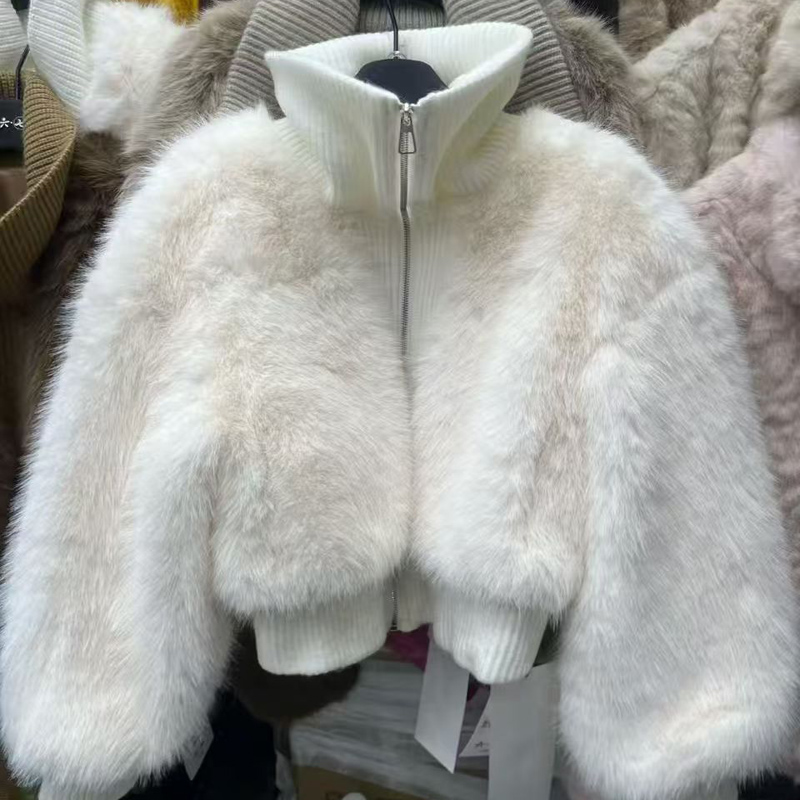 YF6263-(2色入内)冬季名媛气质仿水貂绒毛毛立领拉链拼接针织短款外套