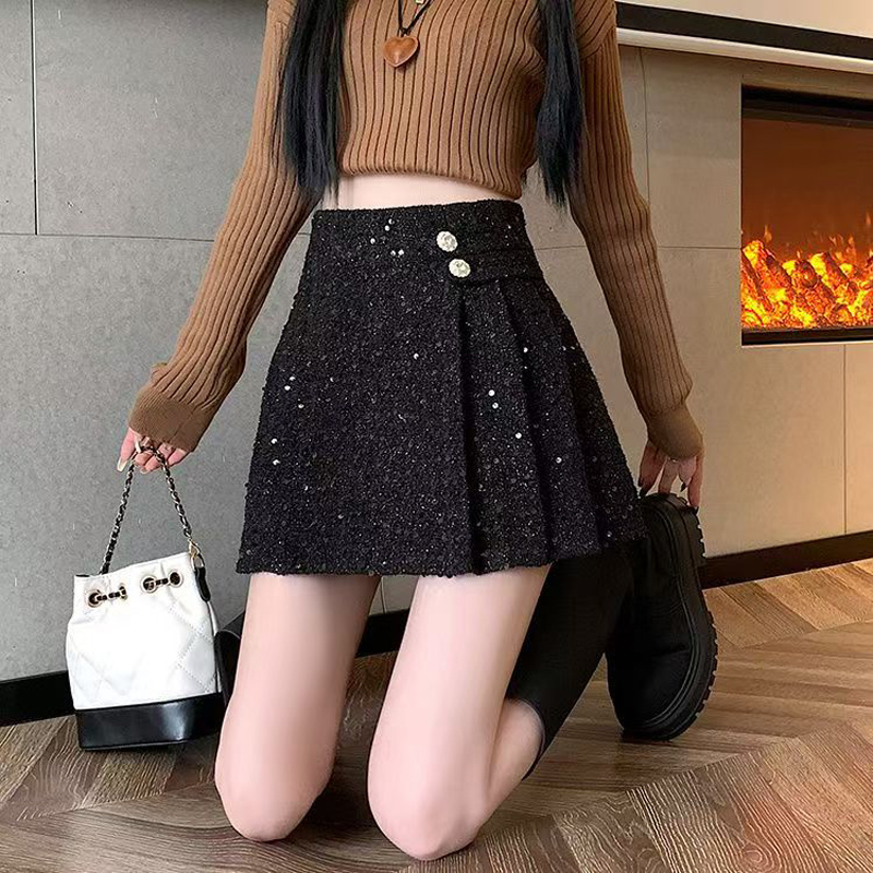 YF6265-(3色入内)秋冬时尚亮片设计收腹高腰褶折A字小香风毛呢防走光短裙