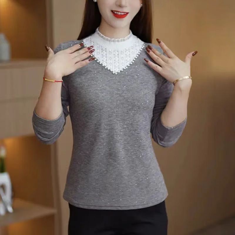 YF6270-(3色入内)春秋名媛气质蕾丝拼接加绒长袖圆领弹力收身显瘦打底衫