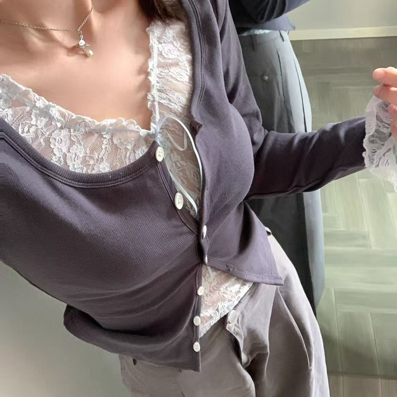 YF6273-图片色蕾丝,内搭木耳边长袖花边V领系结弹力紧身显瘦短款打底衫