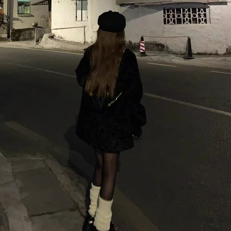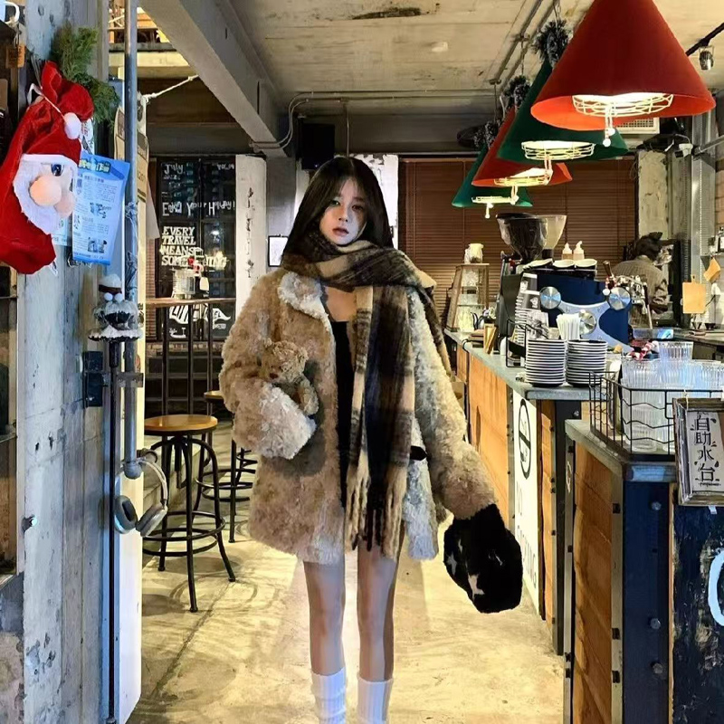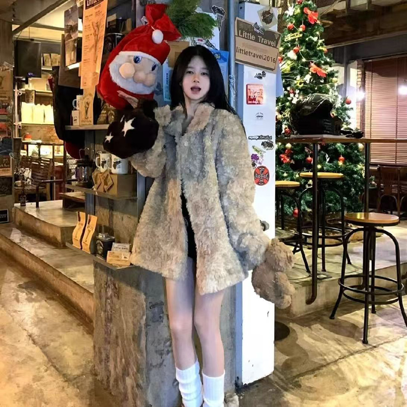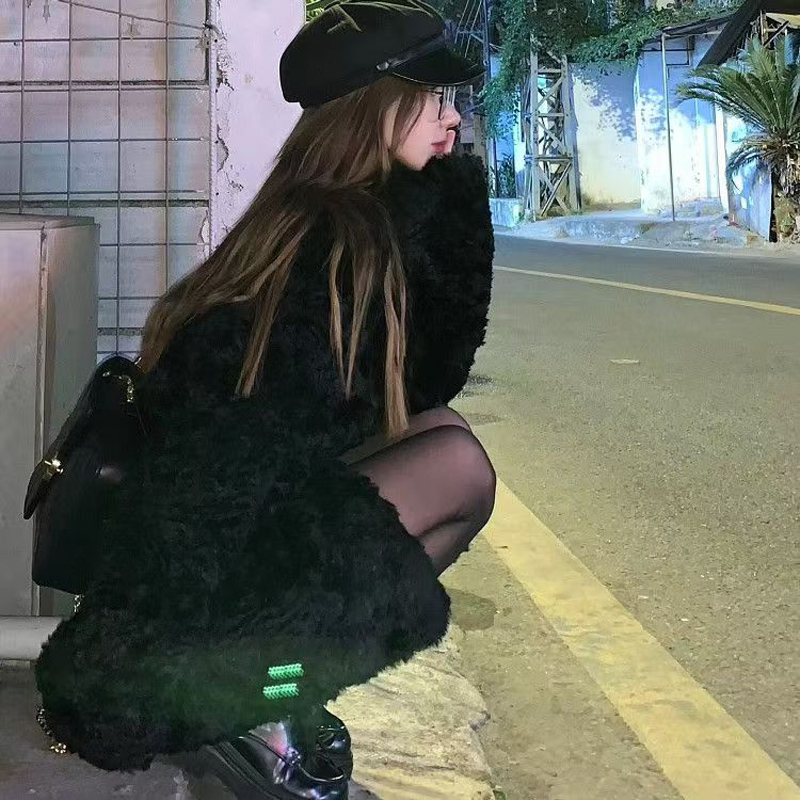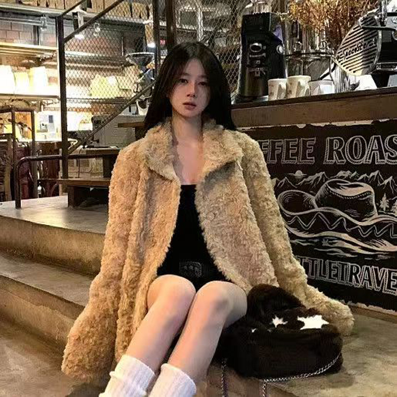 YF6278-(2色入内)冬季仿皮草名媛气质长袖翻领系扣宽松大码毛毛绒大衣