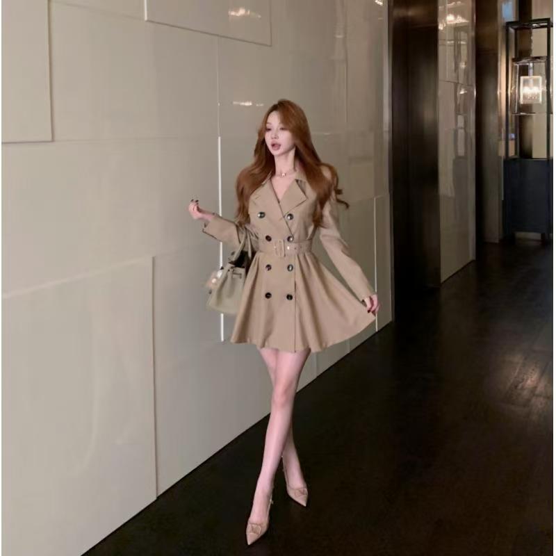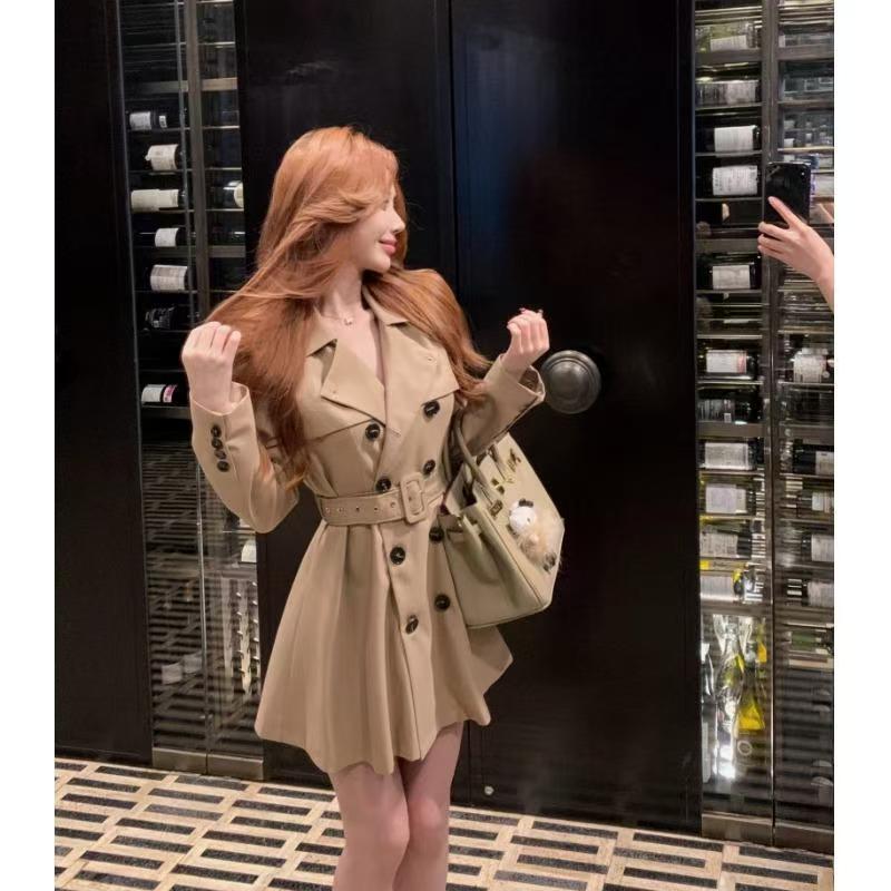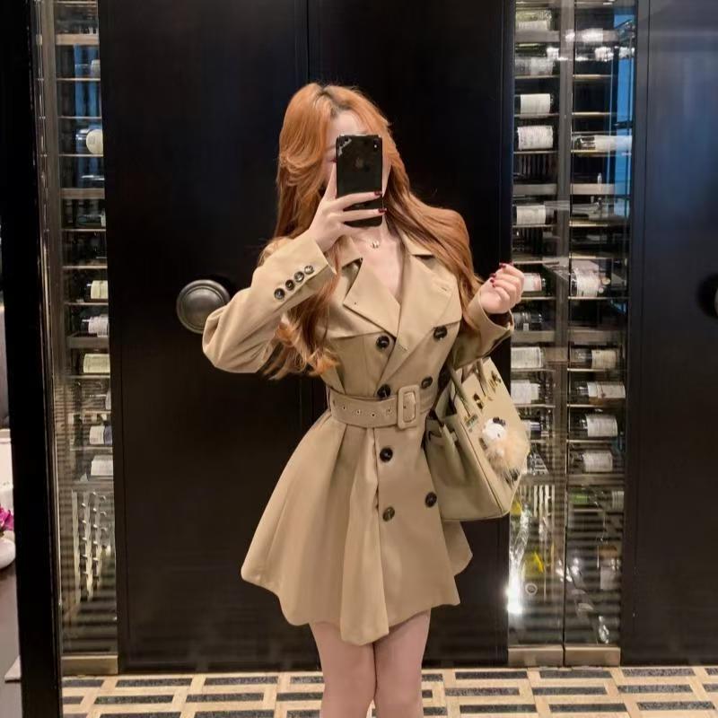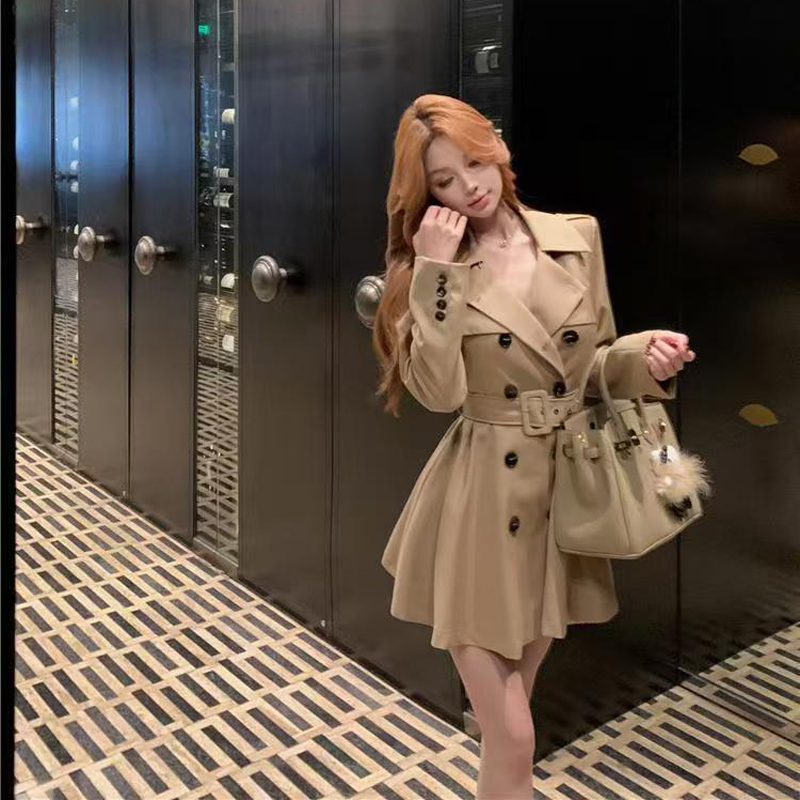 YF6279-图片色韩版简练短款长袖POLO领系腰带双排扣收腰显瘦高级感风衣外套