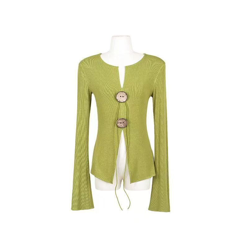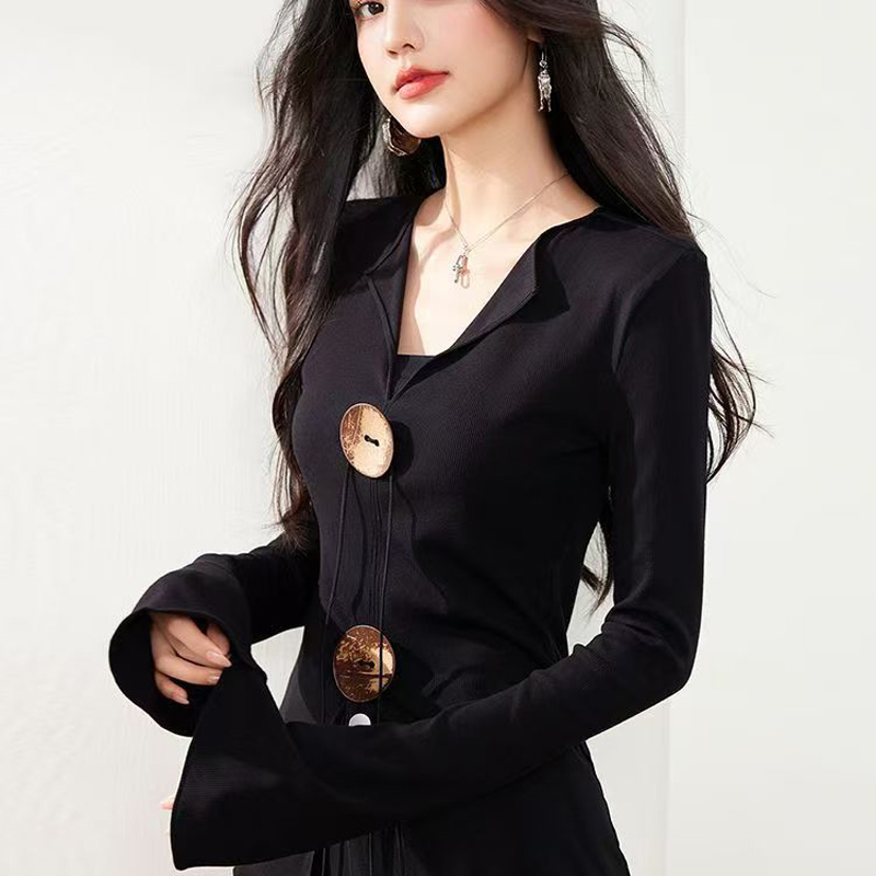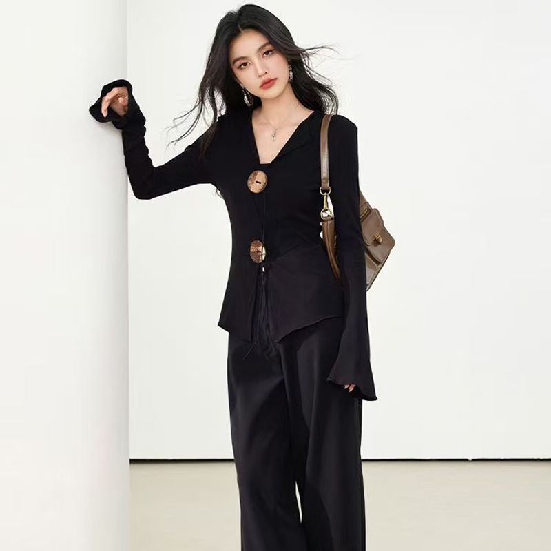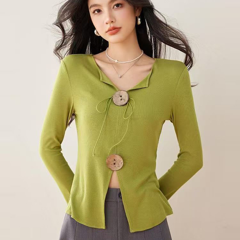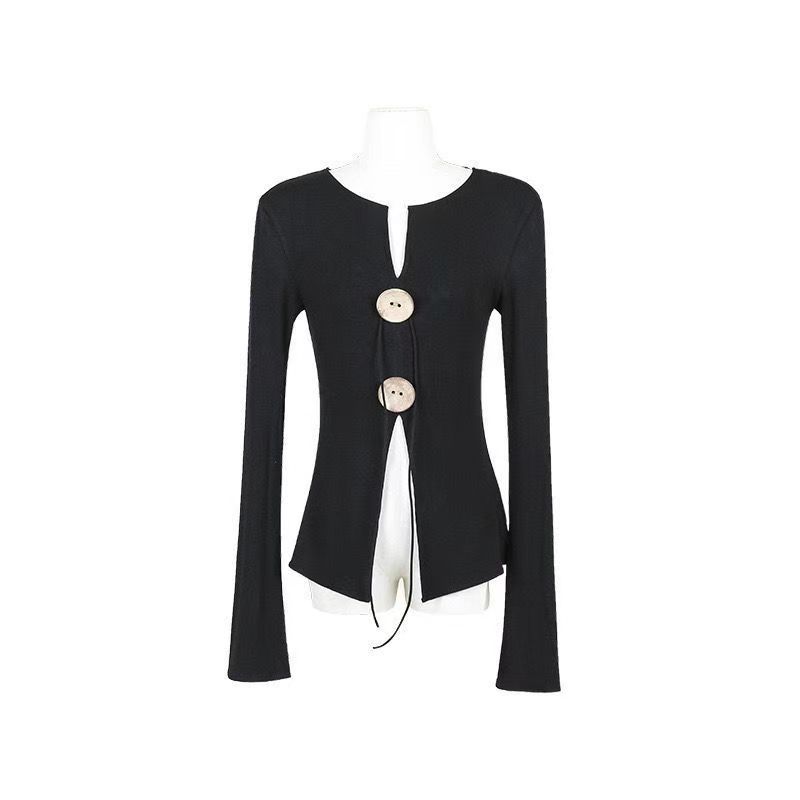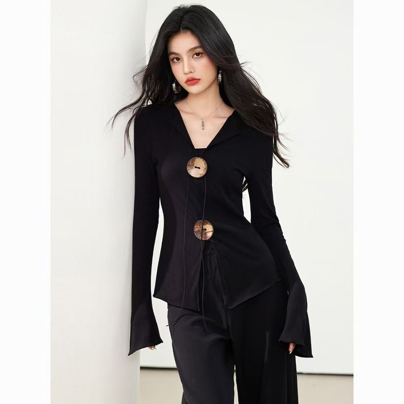 YF6281-(2色入内)韩版时髦春秋新款个性纽扣微喇叭系蝴蝶结开叉洋气上衣