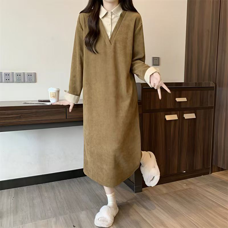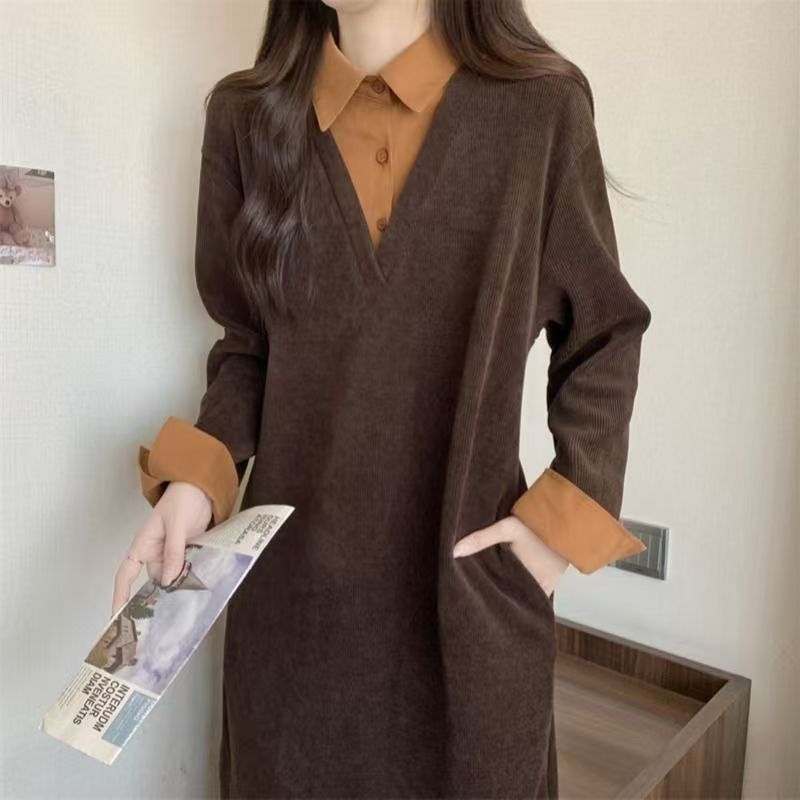 YF6282-(3色入内)慵懒风假两件拼接宽松显瘦直筒POLO领长袖小众秋冬长裙