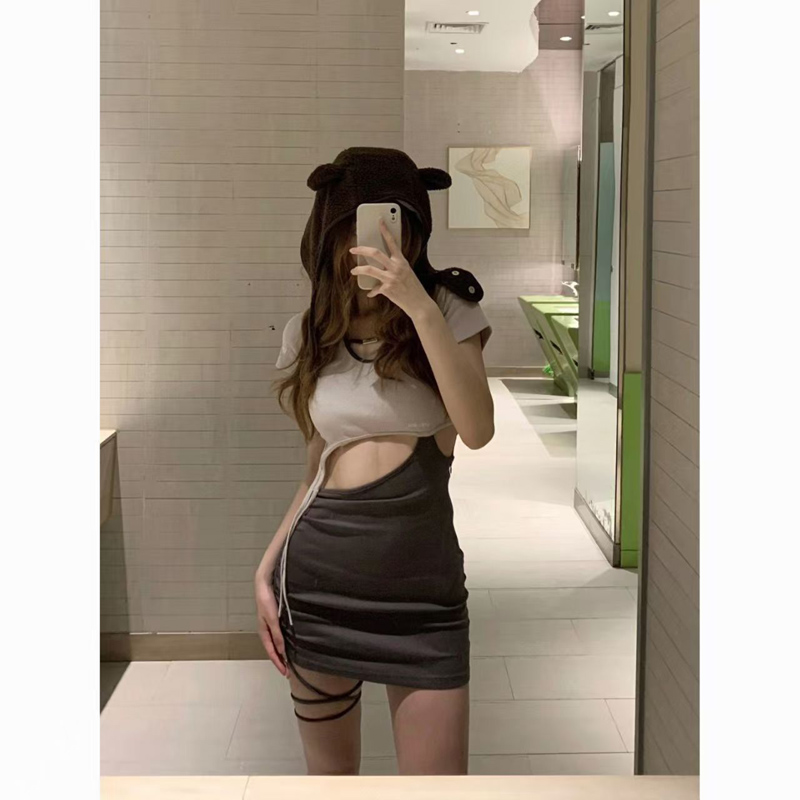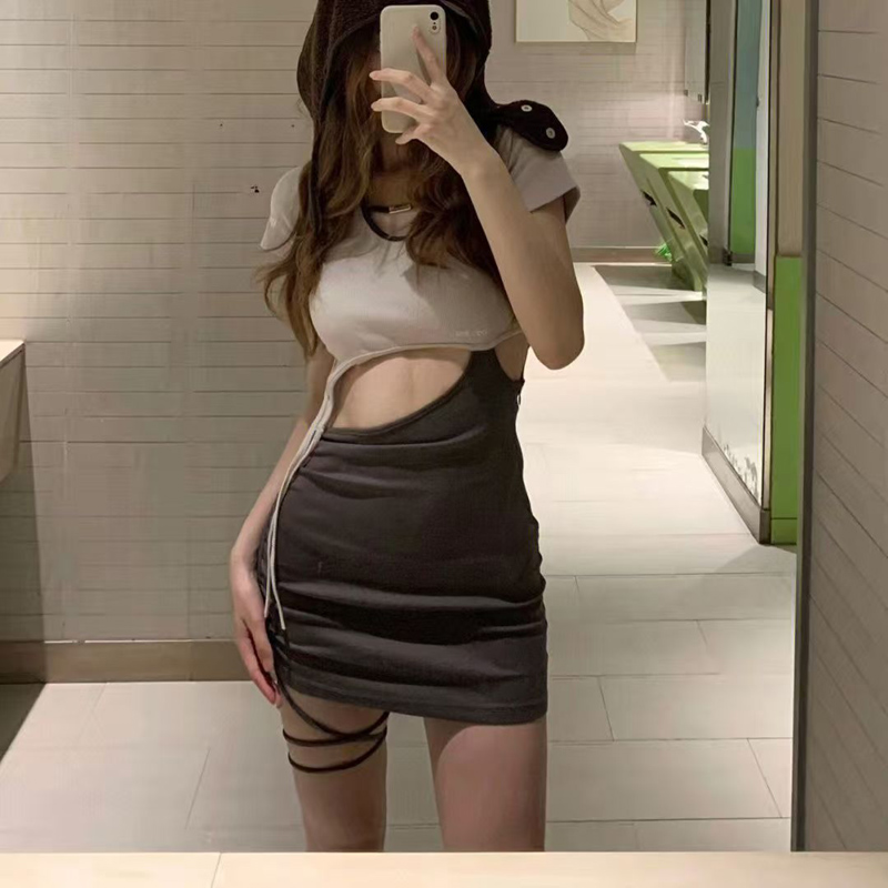 YF6293-图片色假两件开叉镂空短袖翻领侧绑绳弹力包臀小心机夏季连衣裙