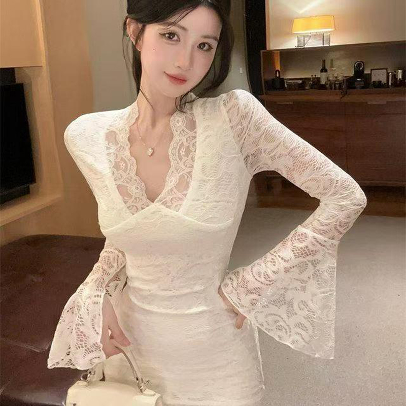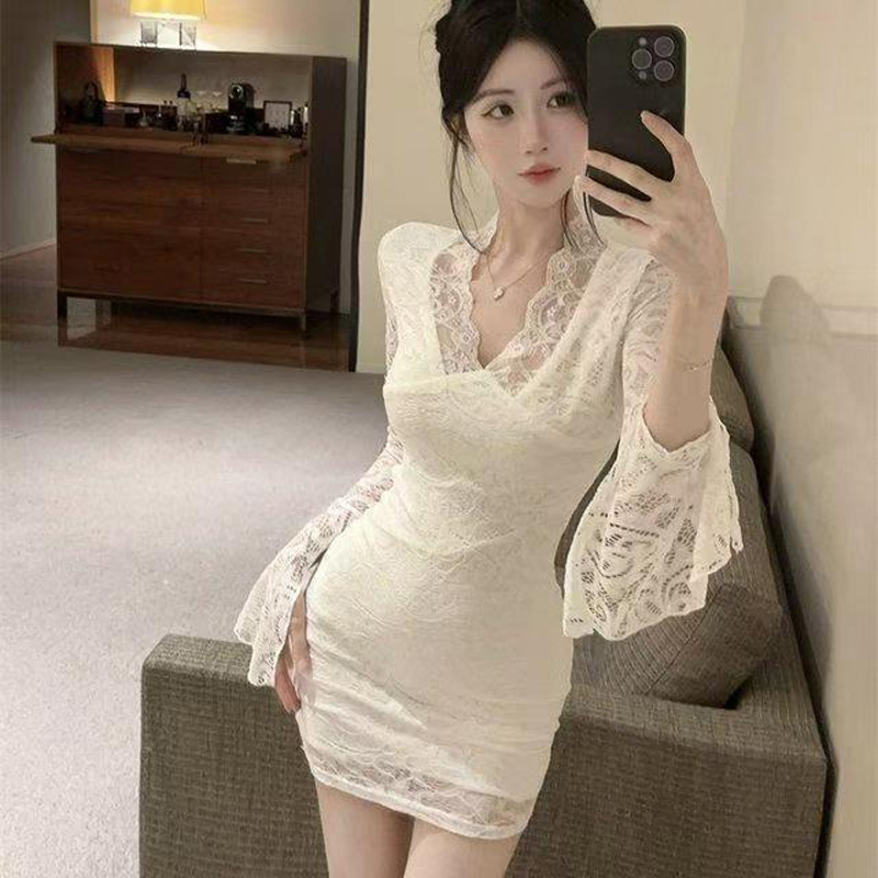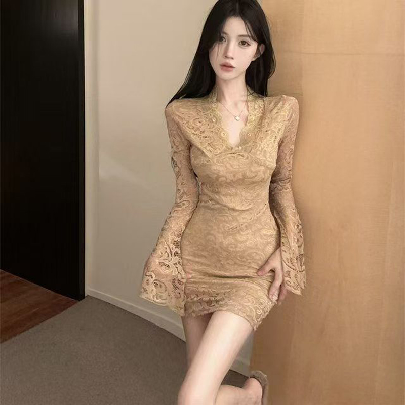 YF6302-(3色入内)微喇叭长袖花边领修腰紧身包臀提花蕾丝名媛气质连衣裙
