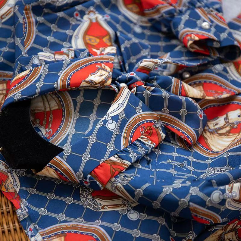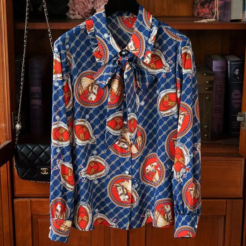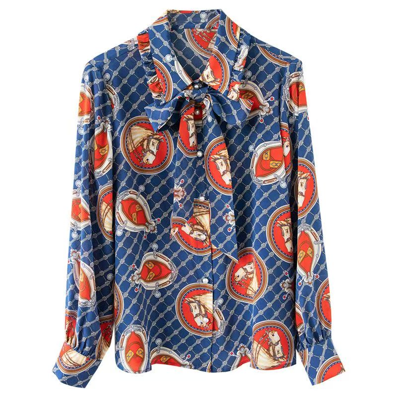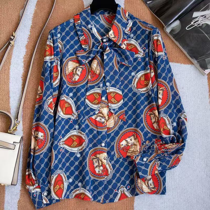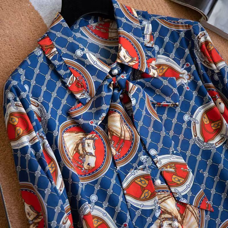 YF6316-图片色时尚个性天马印花长袖系蝴蝶结丝质链子菱形格子大码雪纺衫