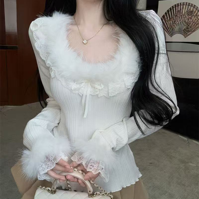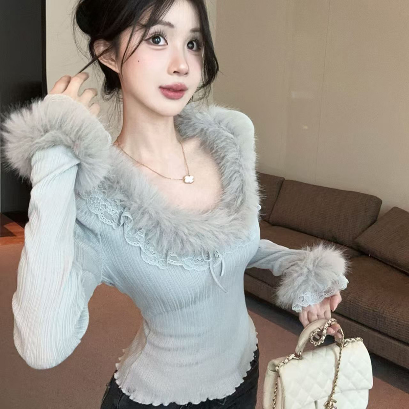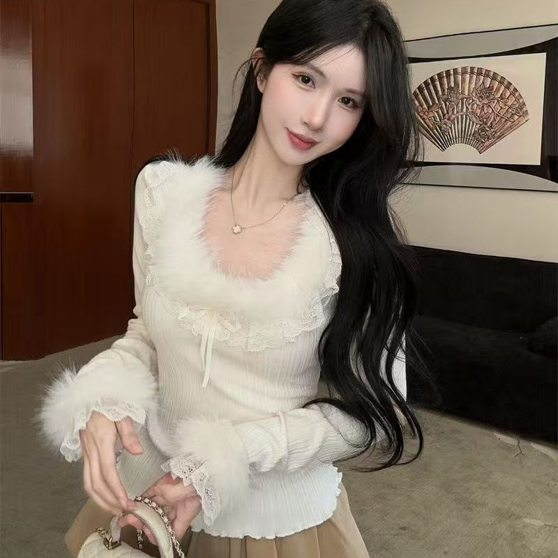YF6321-(3色入内)甜美毛毛领荷叶连系蝴蝶结弹力修身短款小可爱紧身上衣