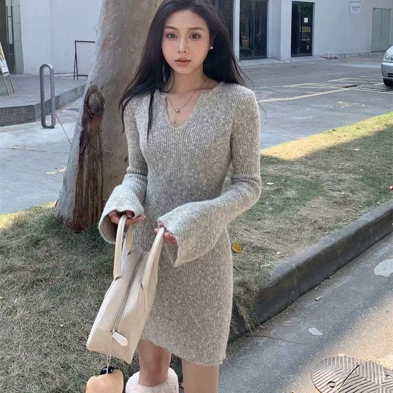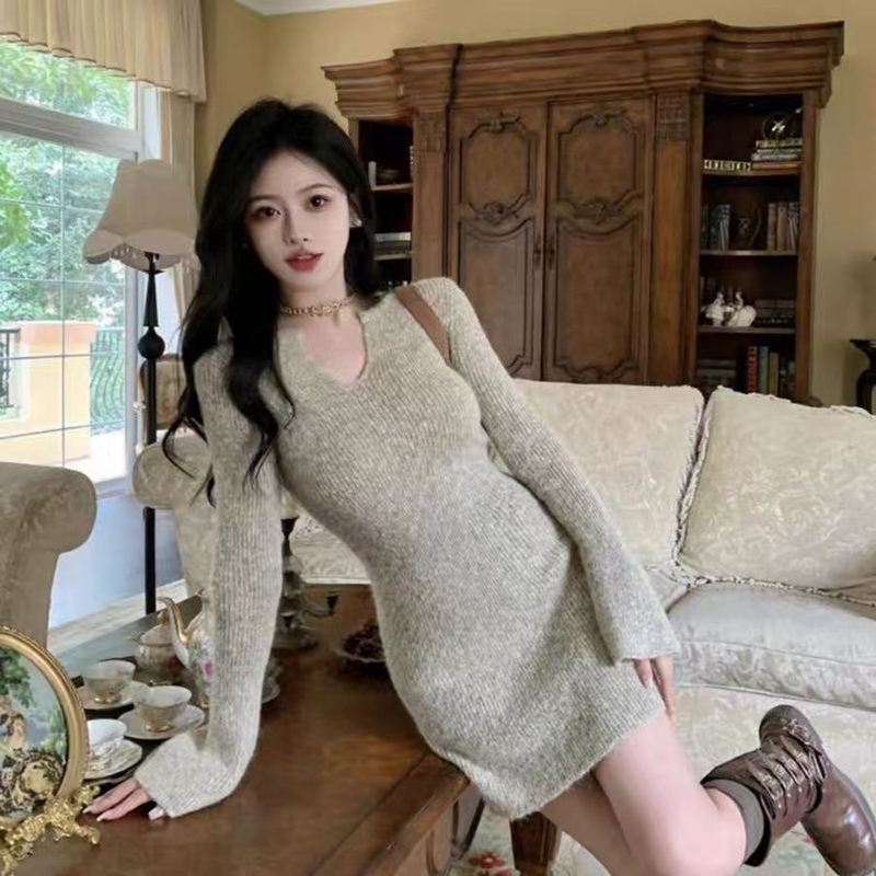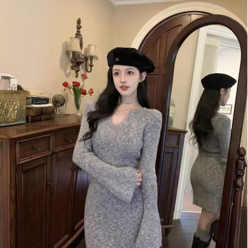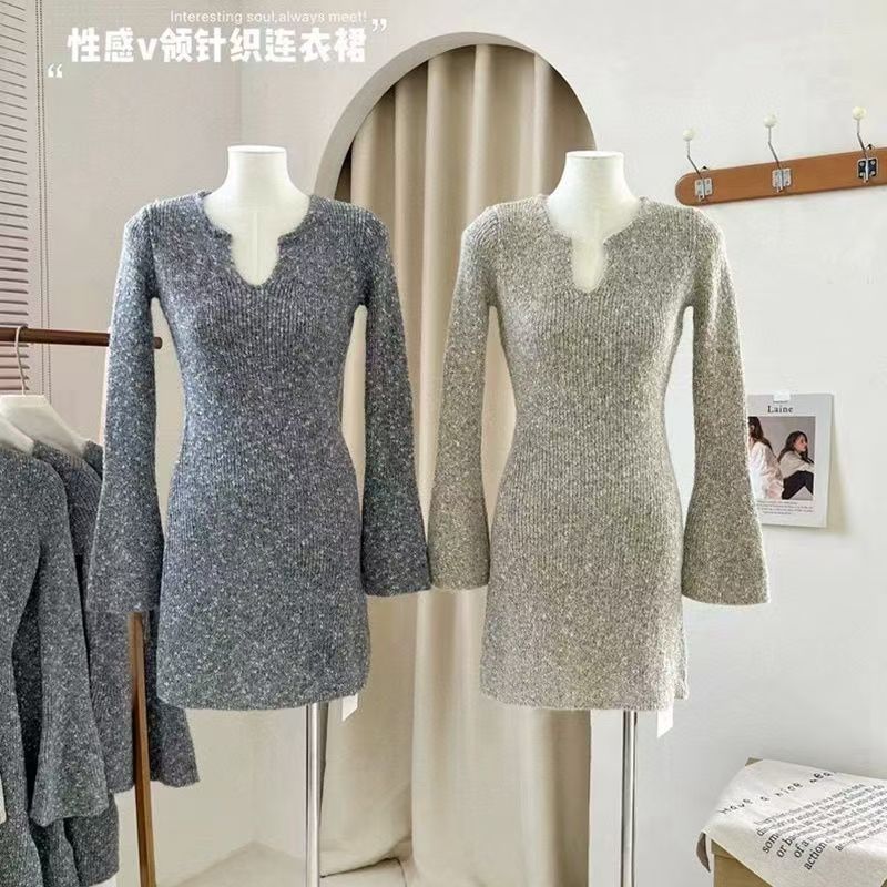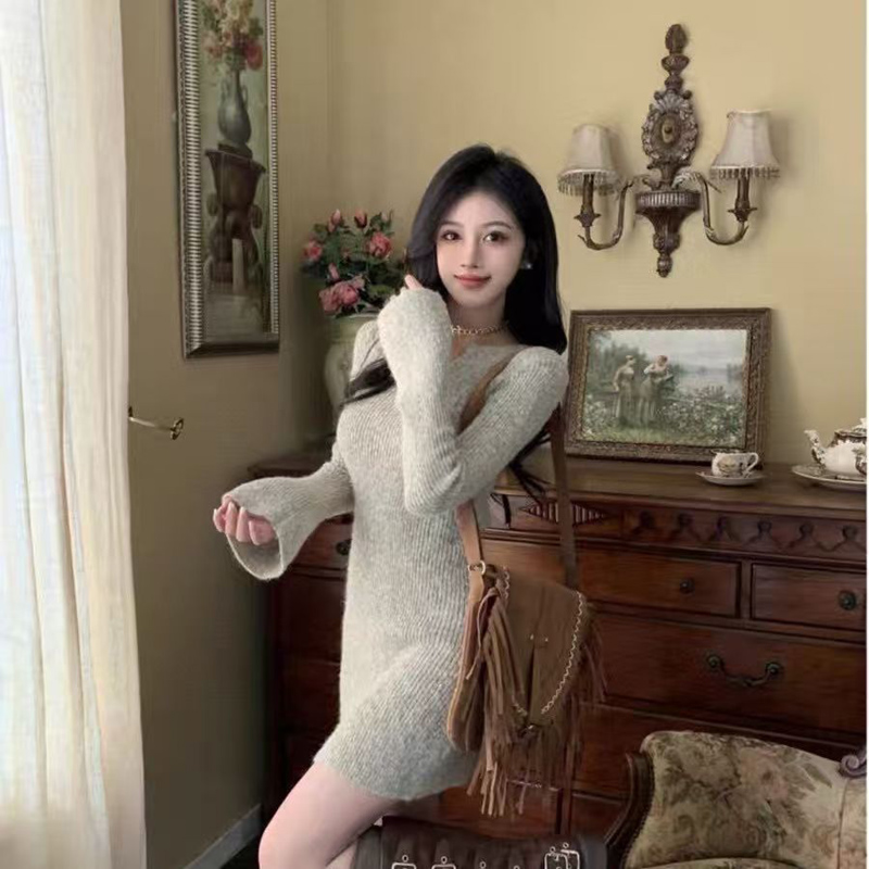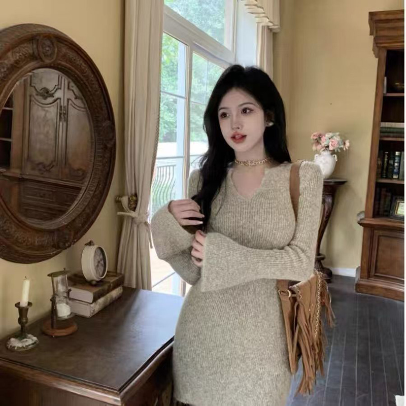 YF6328-(2色入内)冬季微喇叭长袖U型镂空弹力修身包臀针织打底连衣裙