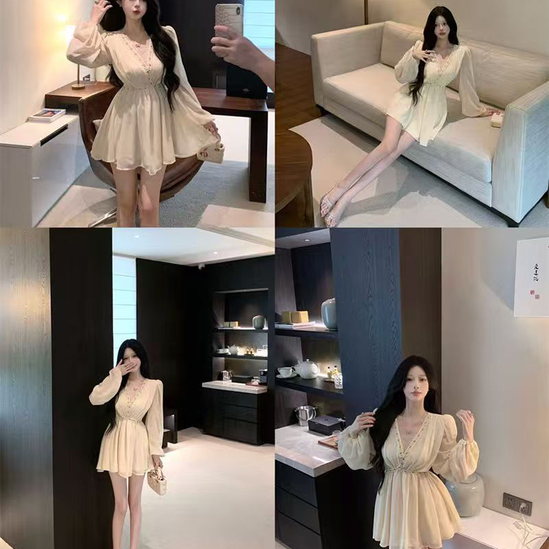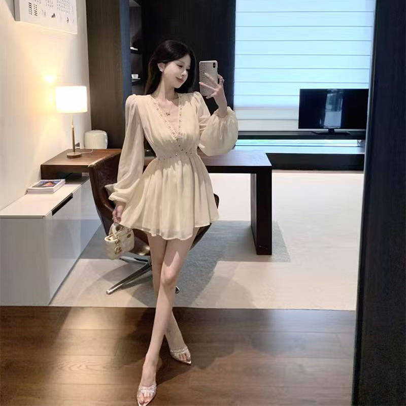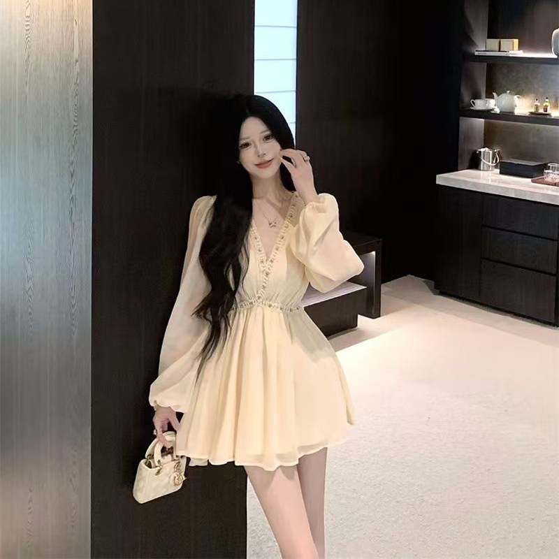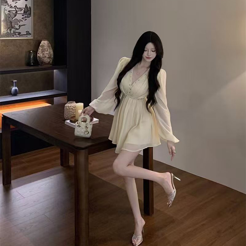 YF6340-图片色优雅雪纺连衣裙 灯笼袖重工钉珠V领松紧腰褶折法式裙子