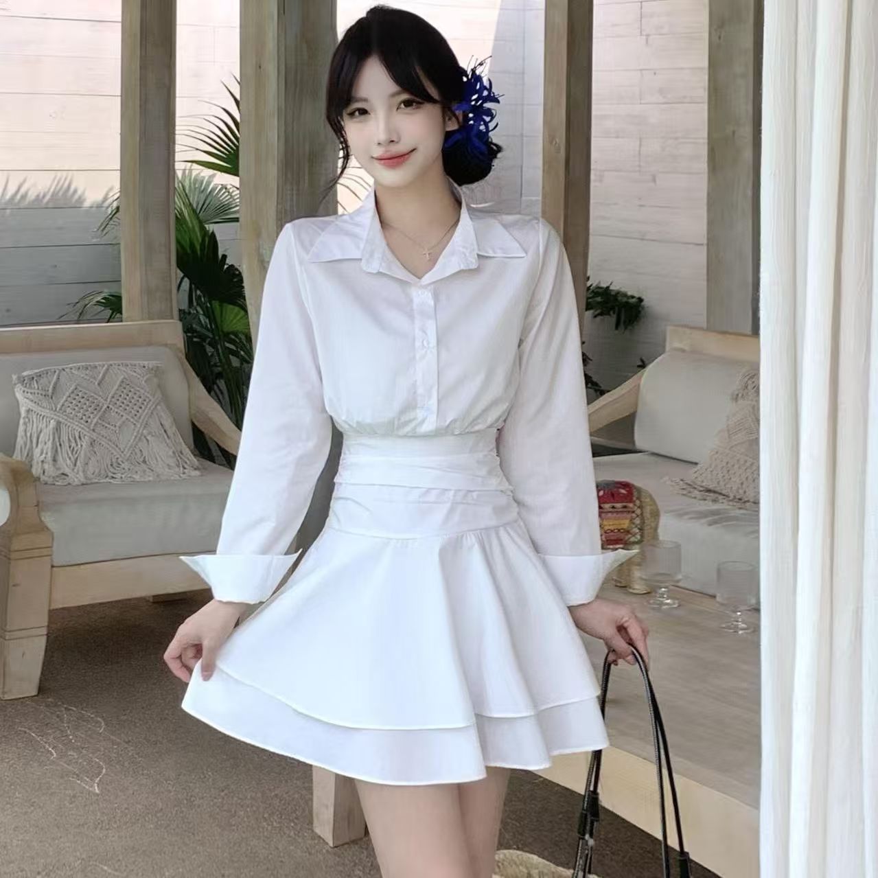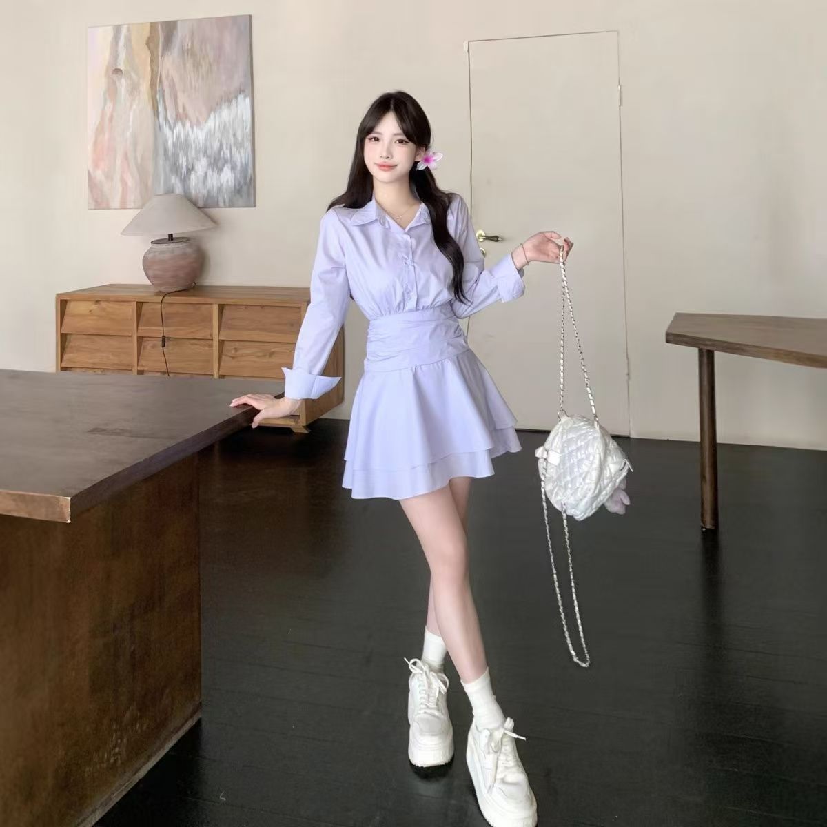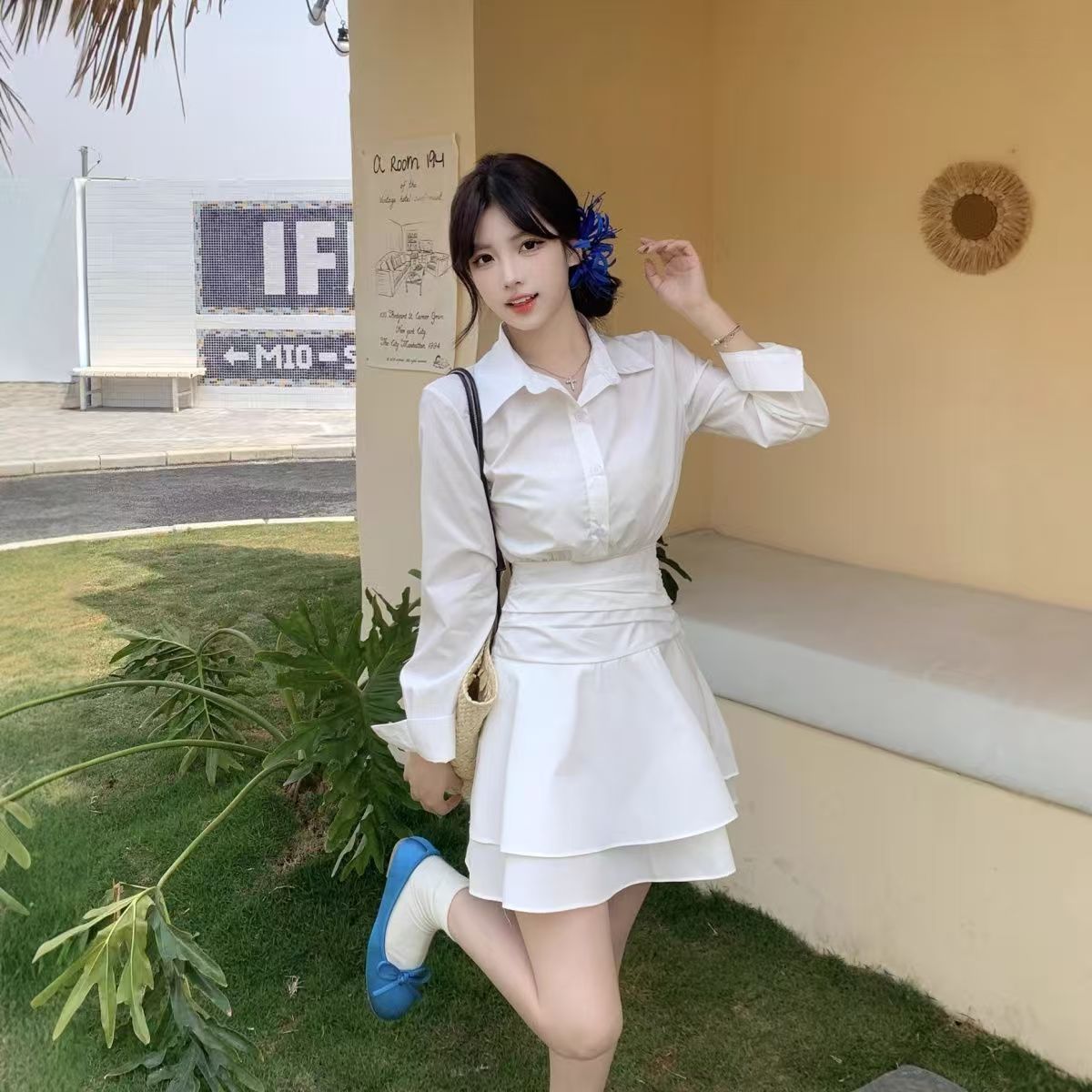 YF6343-(3色入内)韩版新款长袖翻领系扣束腰褶折纯色假两件衬衣款连衣裙