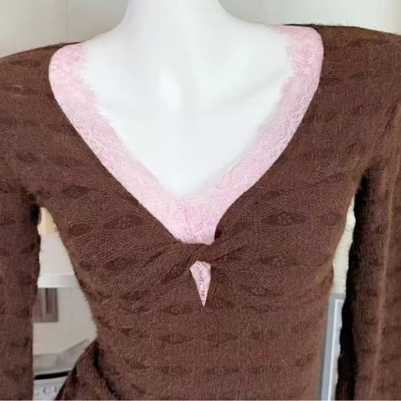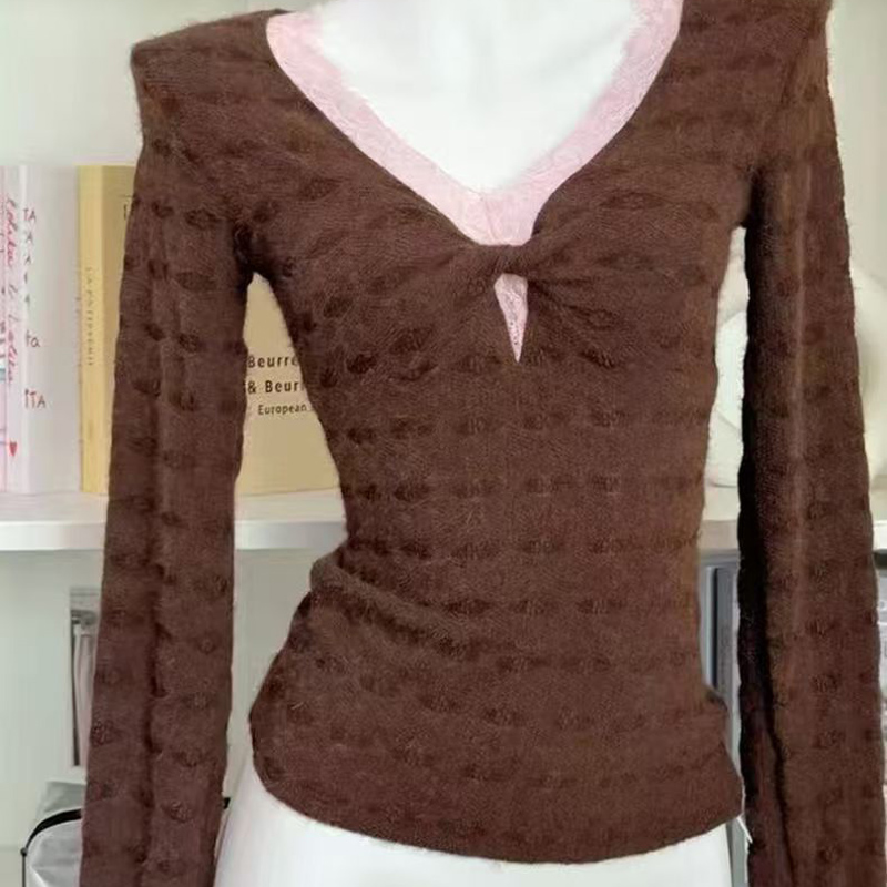 YF6352-图片色甜美时尚蕾丝拼接V领设计扭纹镂空弹力收腹显别致上衣