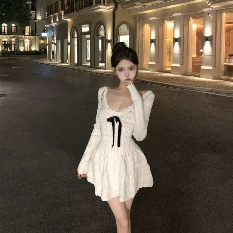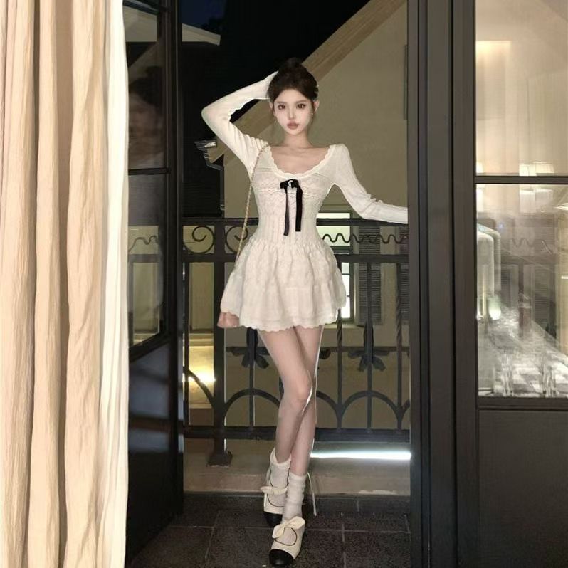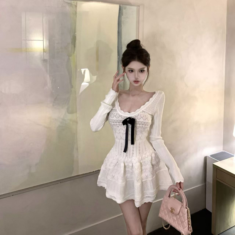 YF6355-图片色甜美小清新镂空勾花设计长袖蝴蝶结烫钻设计修腰显瘦蕾丝裙