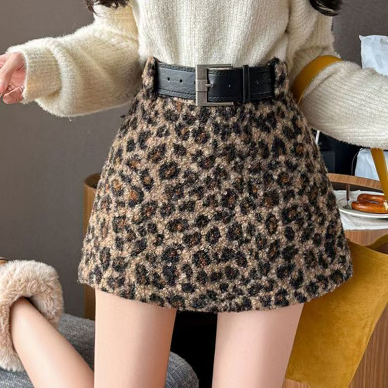 YF6357-(2色入内)性感辣妹豹纹印花高腰A字斑点纹设计复古风毛绒冬装短裙