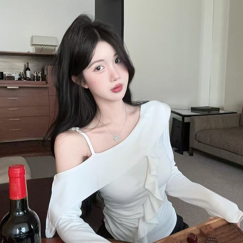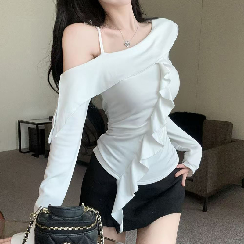 YF6361-(2色入内)性感时尚露单肩一字肩不规则荷叶边开叉吊带春秋纯欲风打底衫