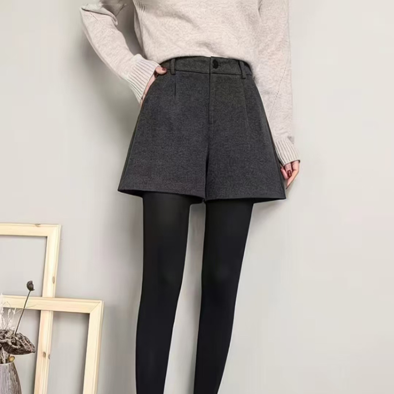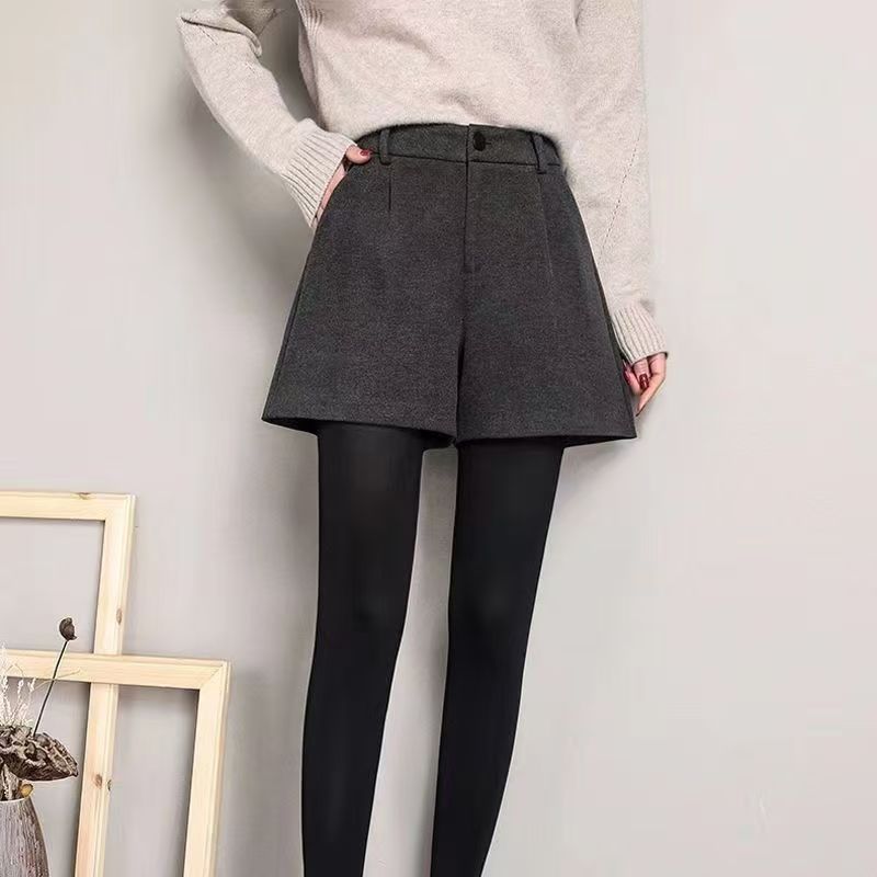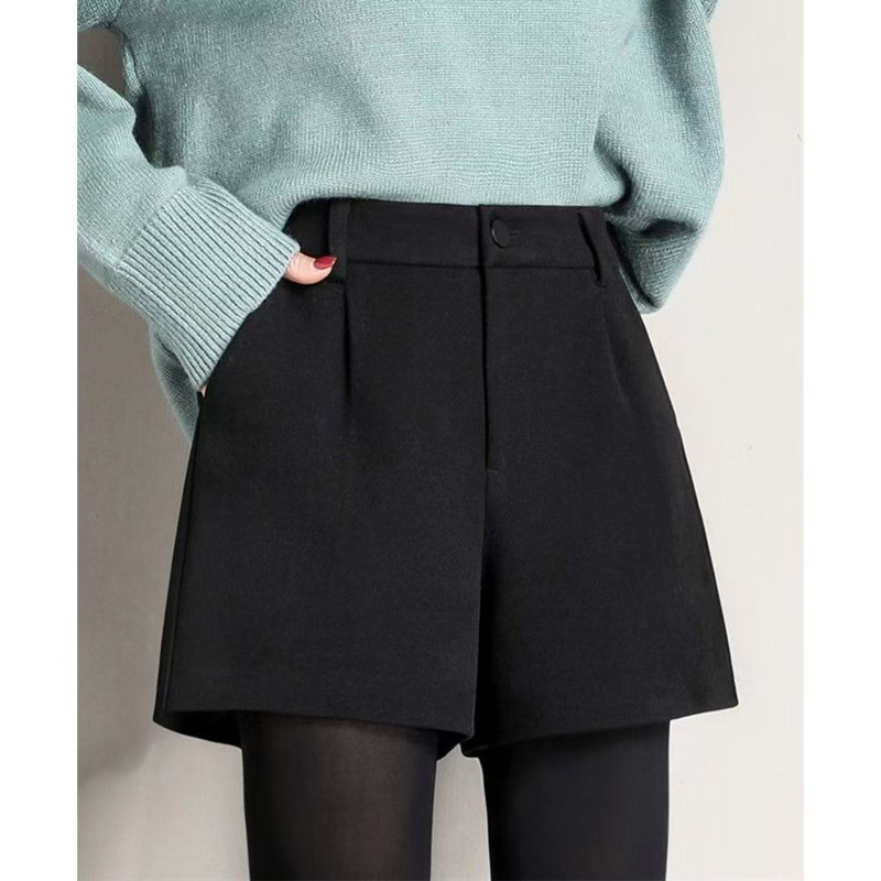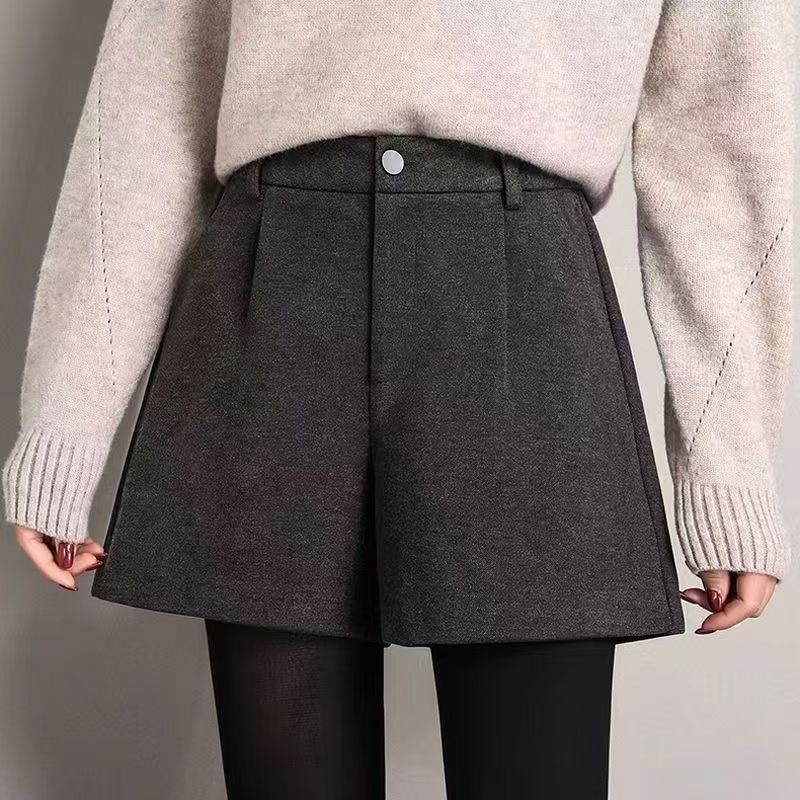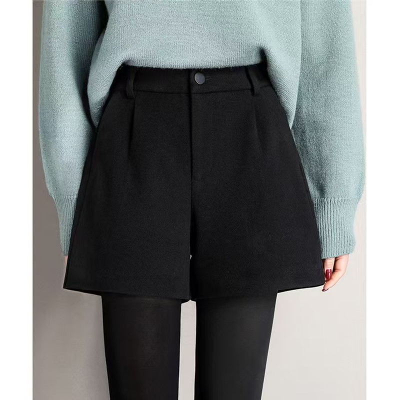 YF6363-(2色入内)2025新款加厚毛呢系扣高腰A字阔腿显瘦纯色百搭冬热款短裤