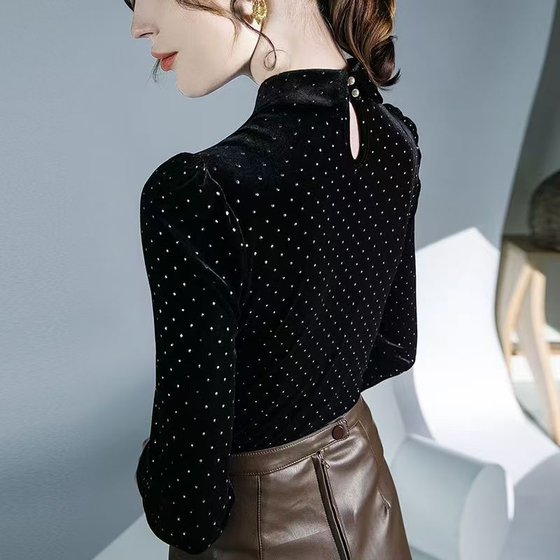YF6364-图片色甜美时尚精品波点网纱拼接透视设计长袖POLO领衬衫