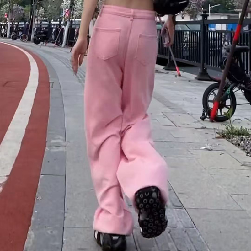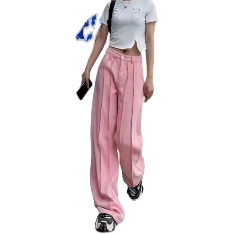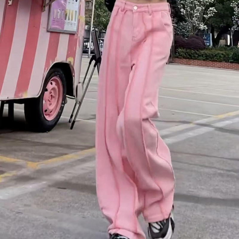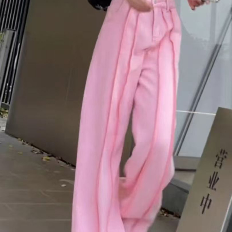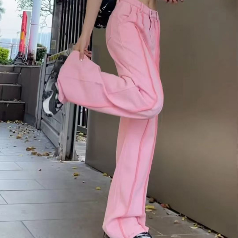 YF6369-图片色港式新款系扣高腰拼接条纹设计感ins风粉色洋气牛仔裤