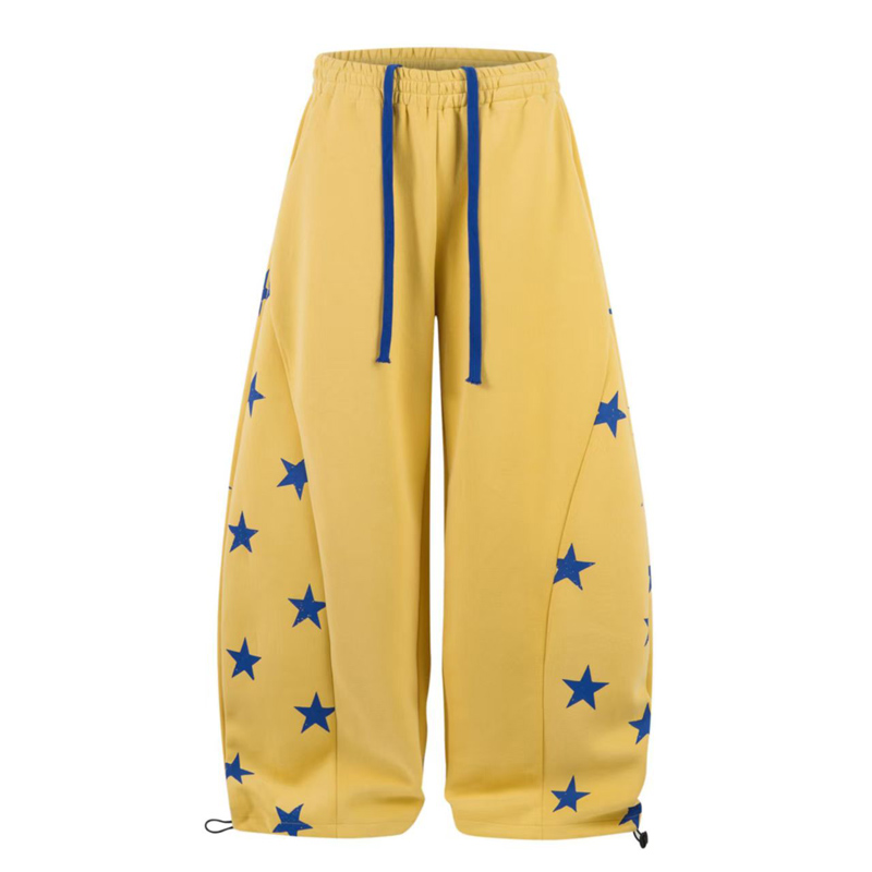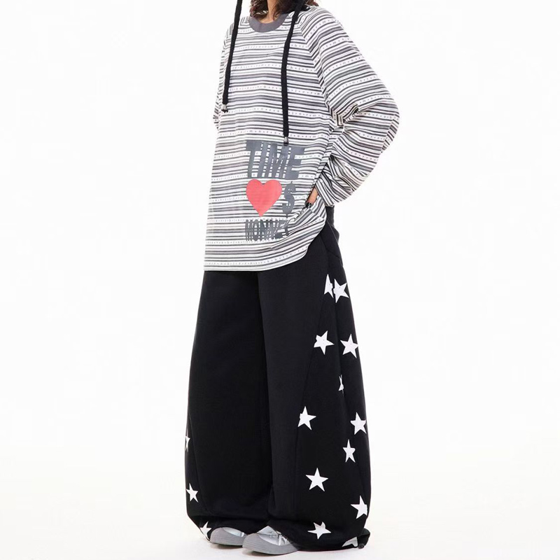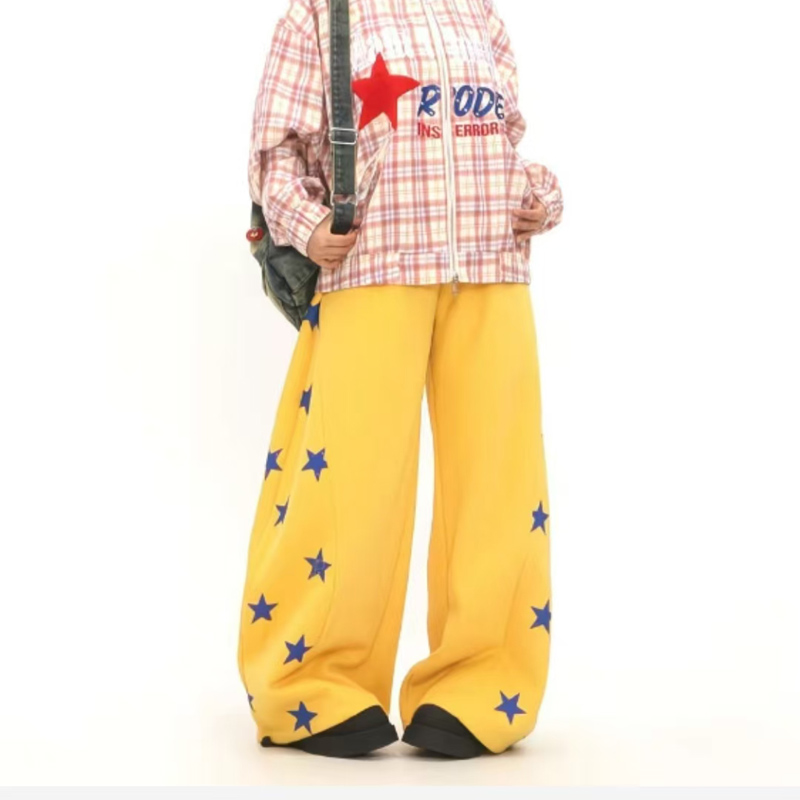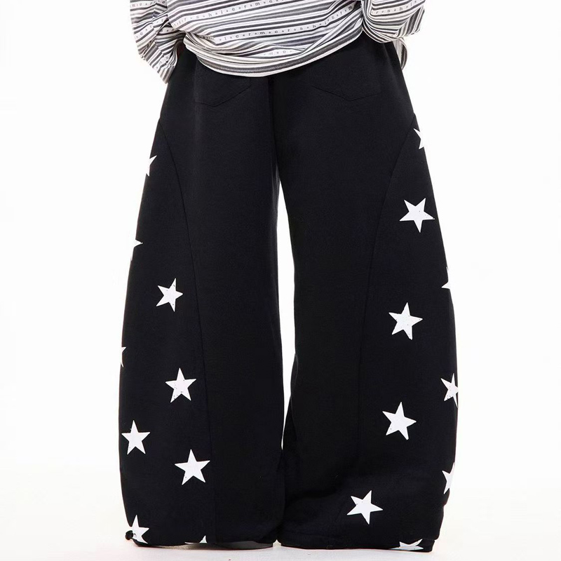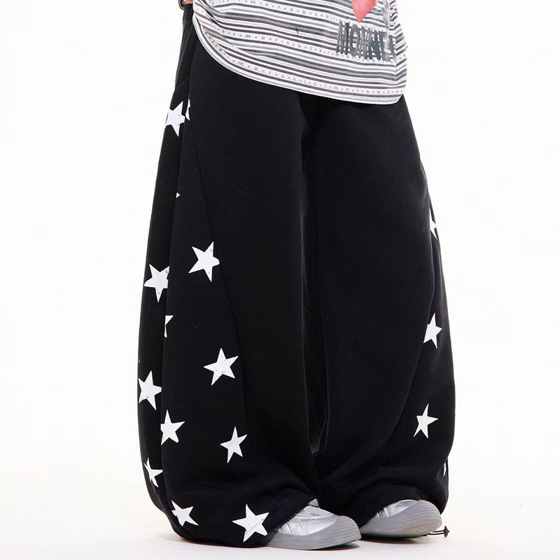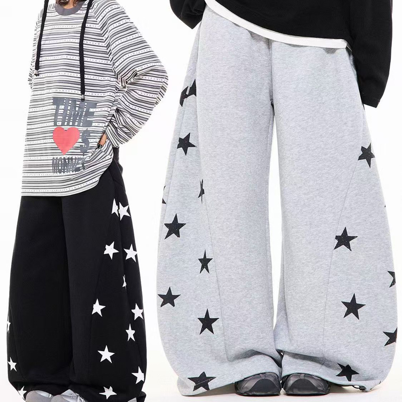 YF6371-(3色入内)韩版新款五角星印花拼接松紧腰抽绳阔腿坠地感CHIC休闲裤