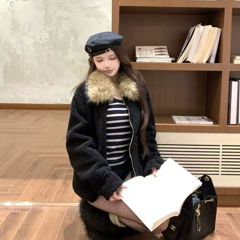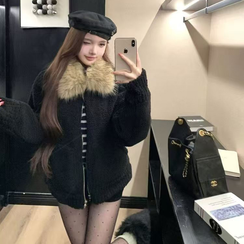 YF6379-图片色名媛气质皮毛一体加厚防风拉链夹克新品百搭大码短款上衣