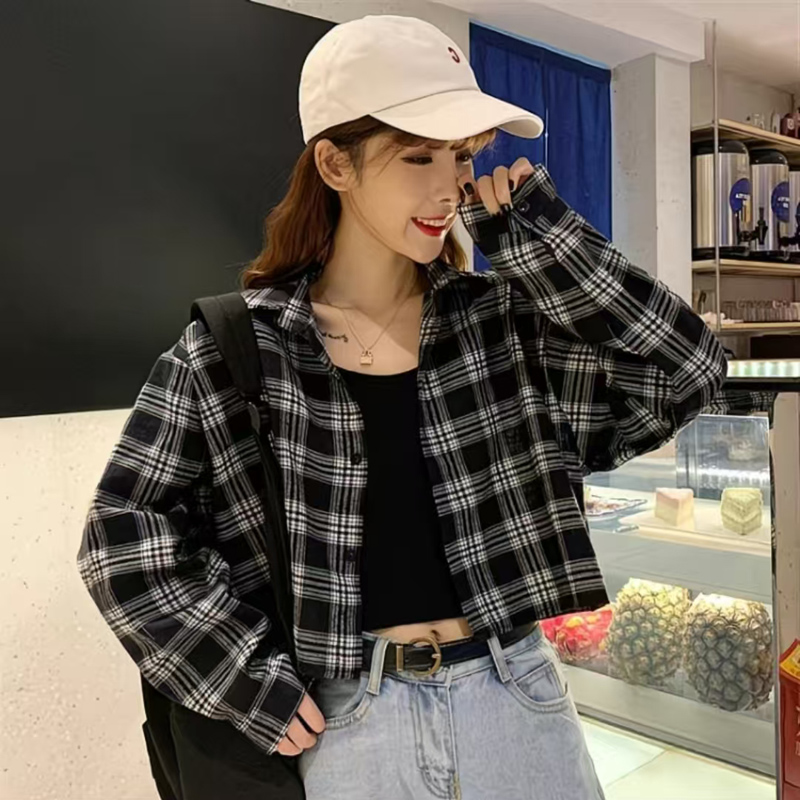 YF6381-(2色入内)时尚小外套短款长袖POLO领复古格子宽松大码百搭上衣