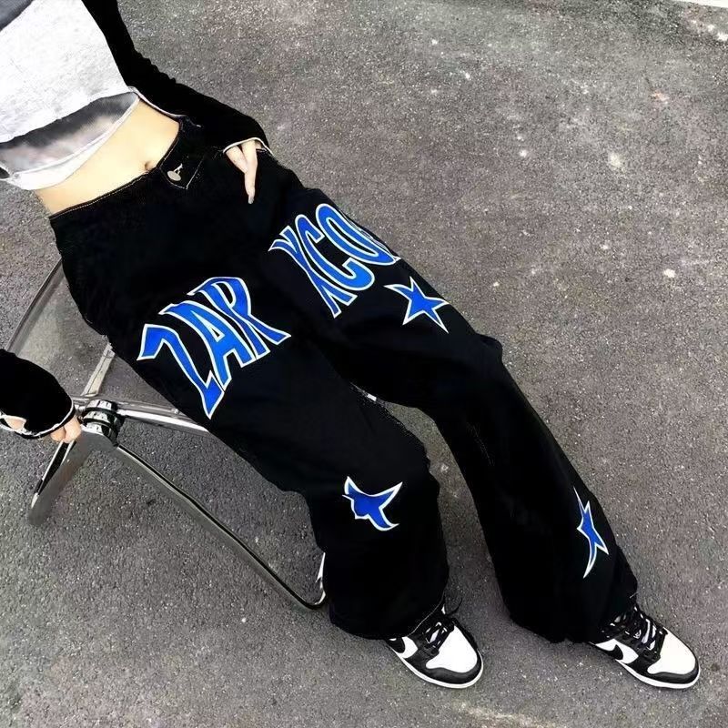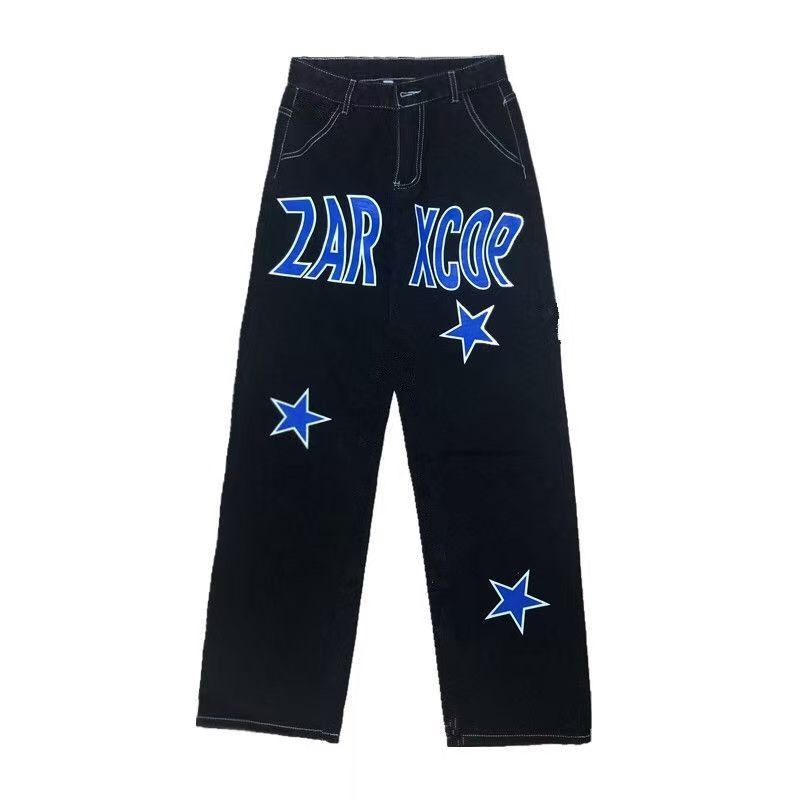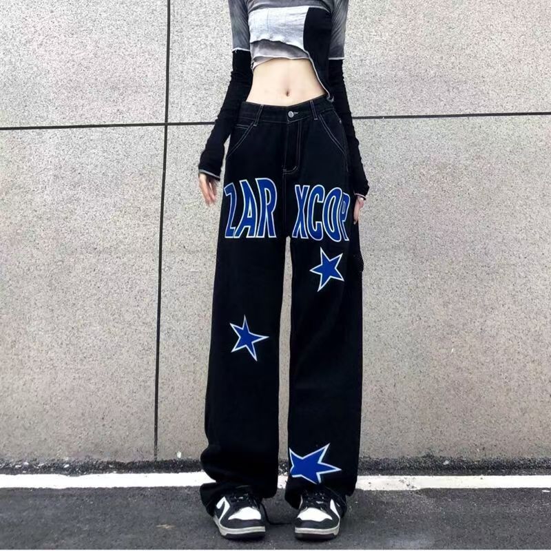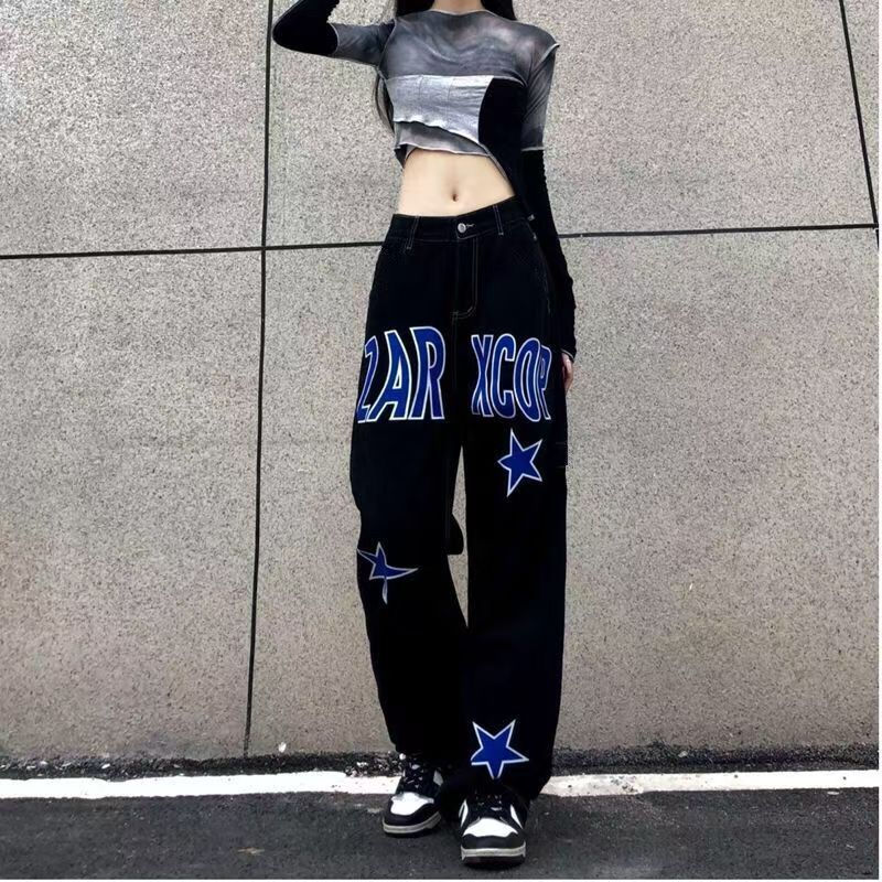 YF6387-图片色港式慵懒风系扣字母印花星星设计潮流新款休闲牛仔裤