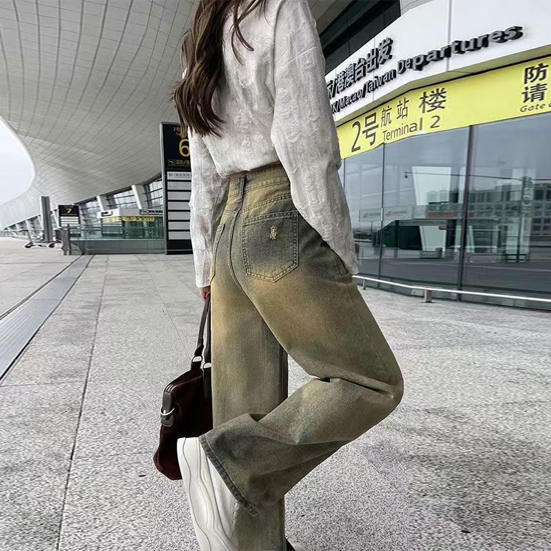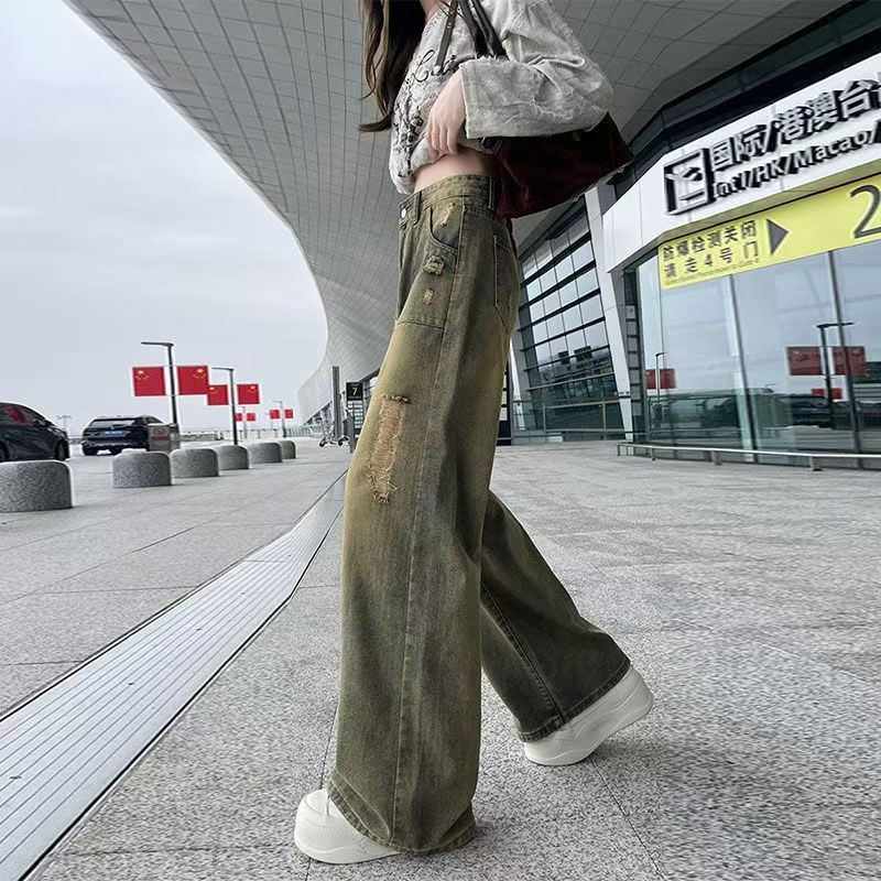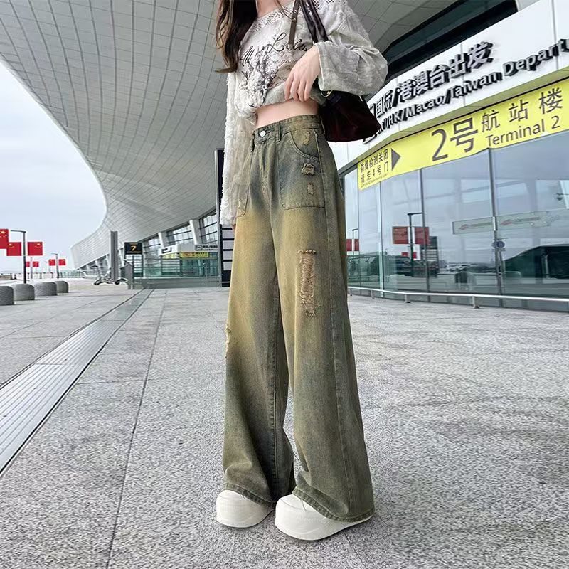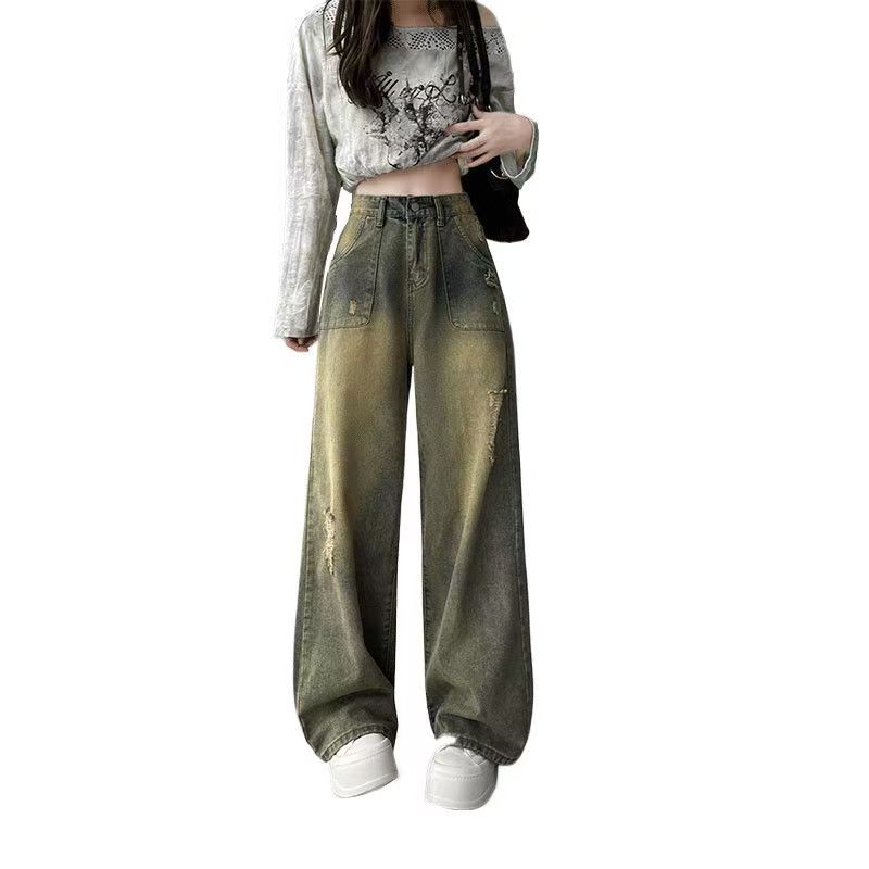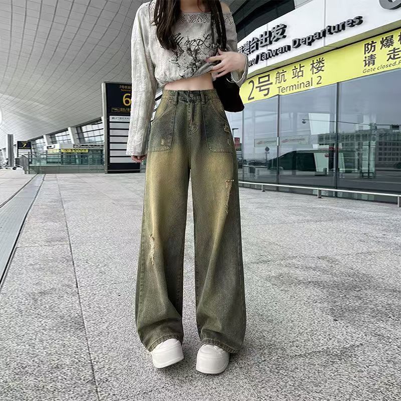 YF6397-图片色港式2025新款洗水系扣高腰破洞阔腿复古坠地感牛仔裤
