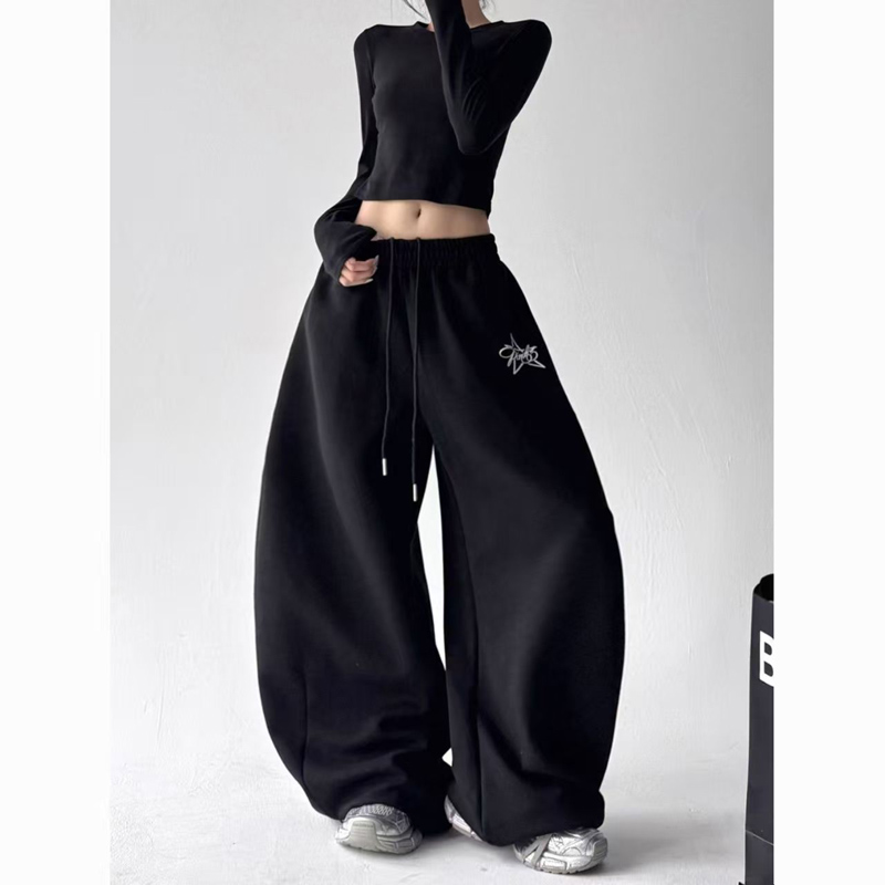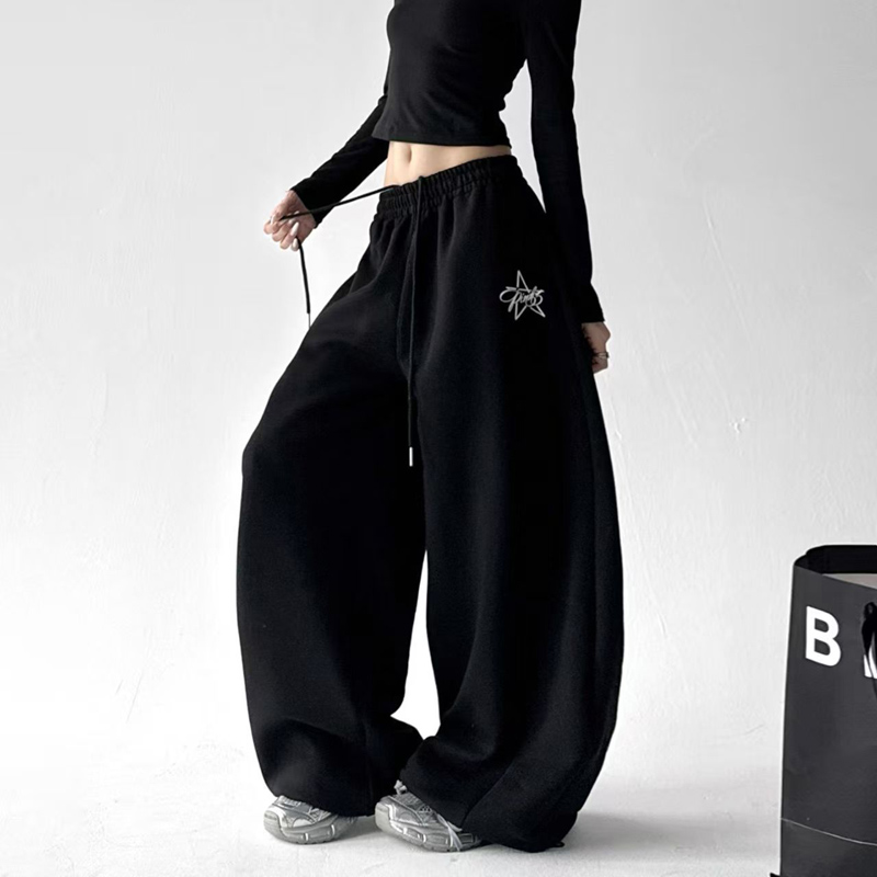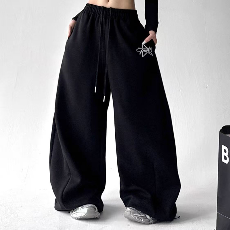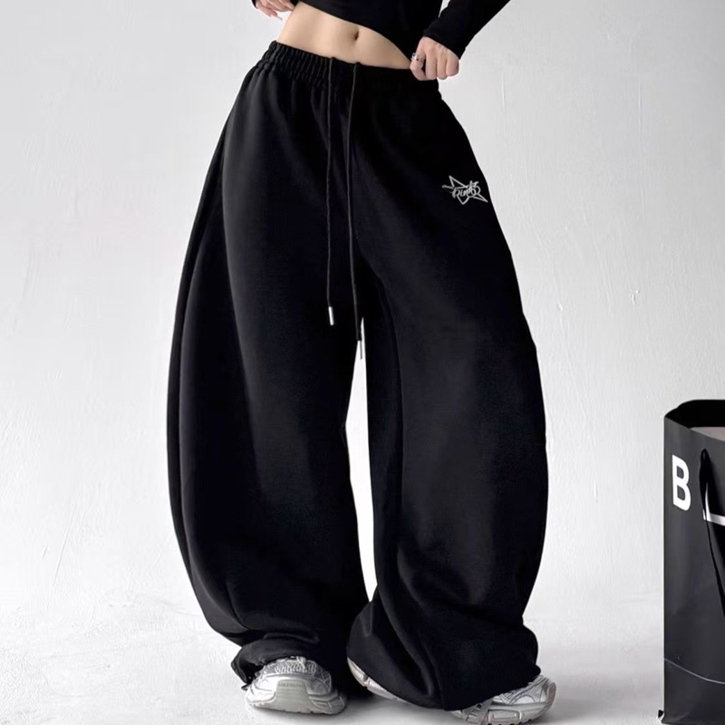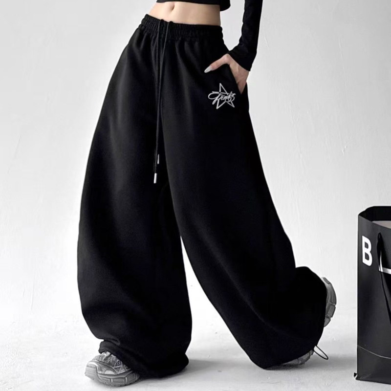 YF6409-(3色入内)港式冬季漫画刺绣松紧腰抽绳直筒阔腿慵懒风休闲卫衣运动裤