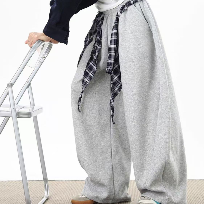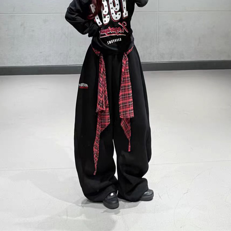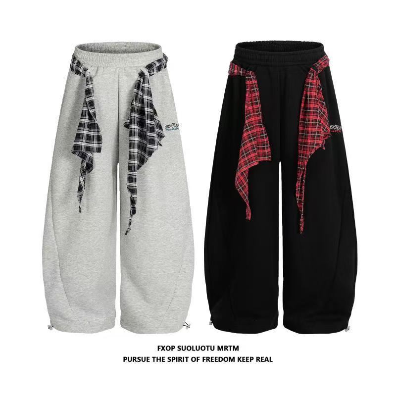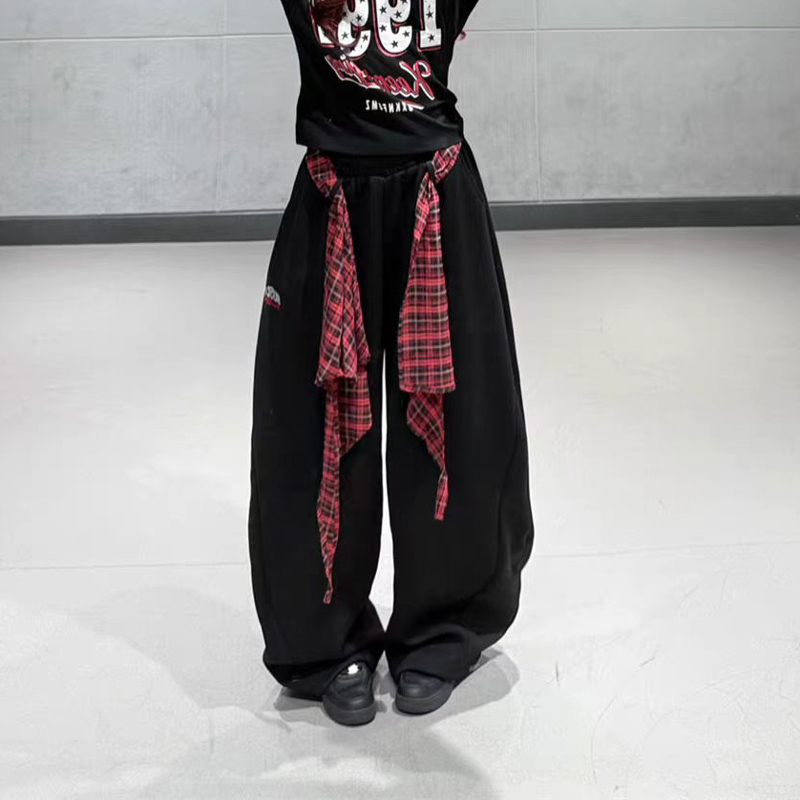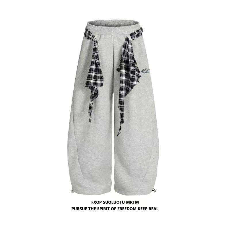 YF6412-(2色入内)原宿风格子飘带系腰个性阔腿运动休闲卫衣裤 嘻哈风长裤