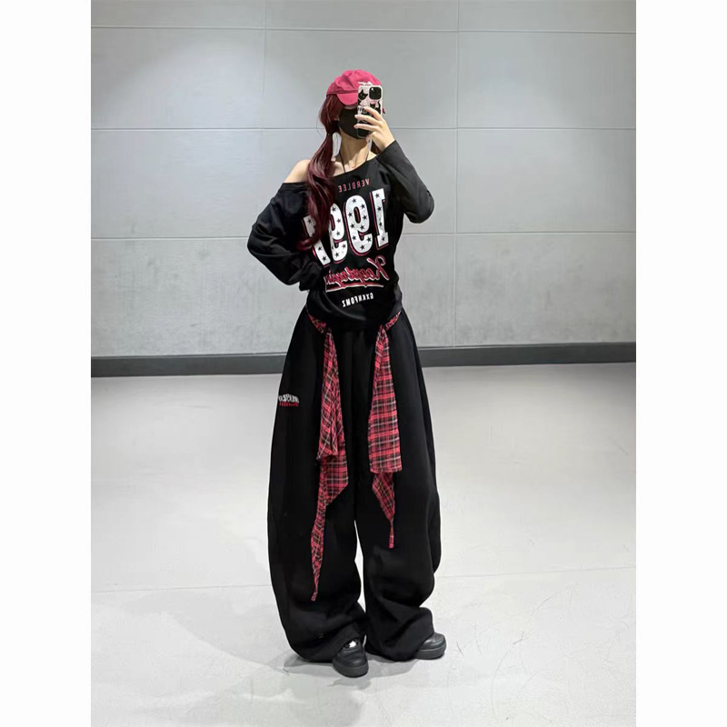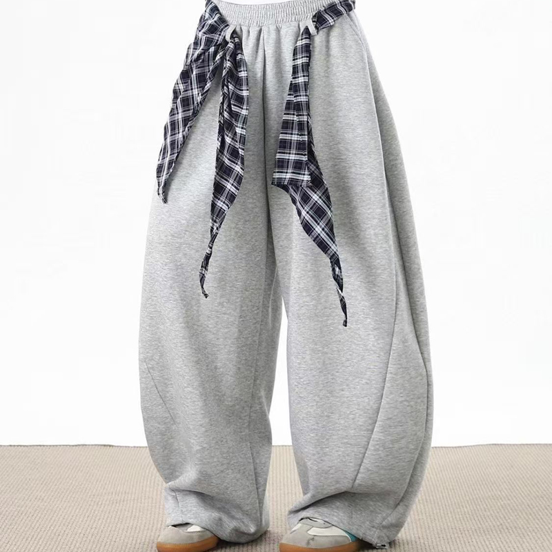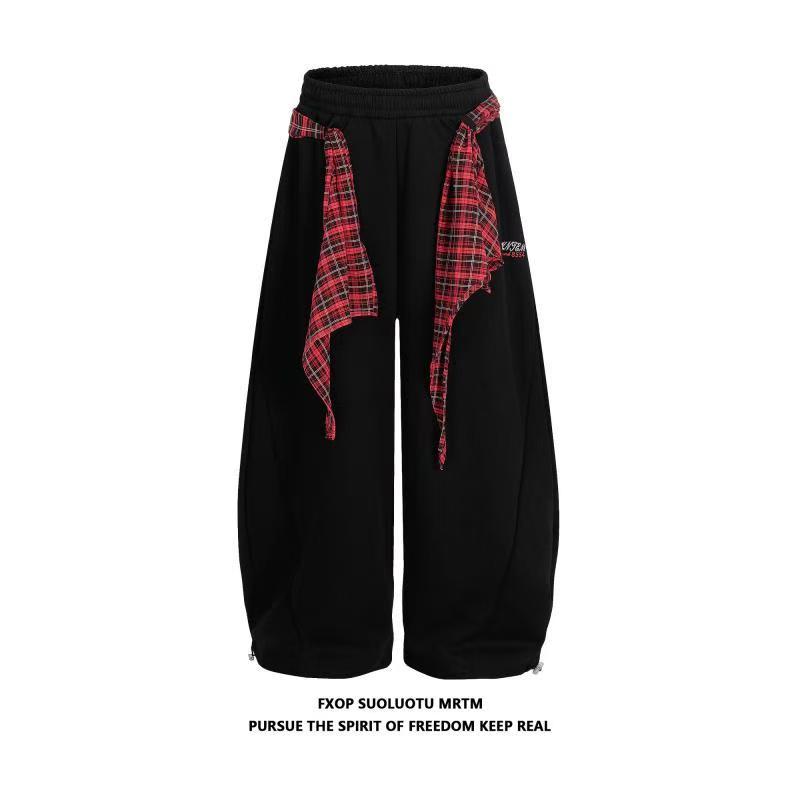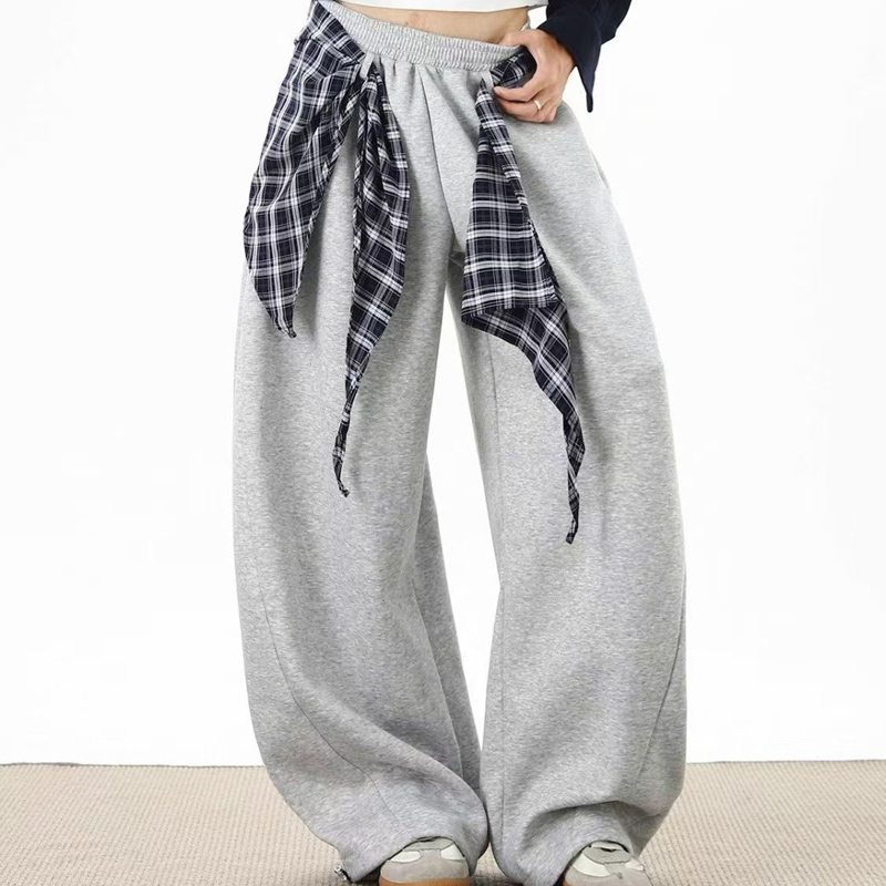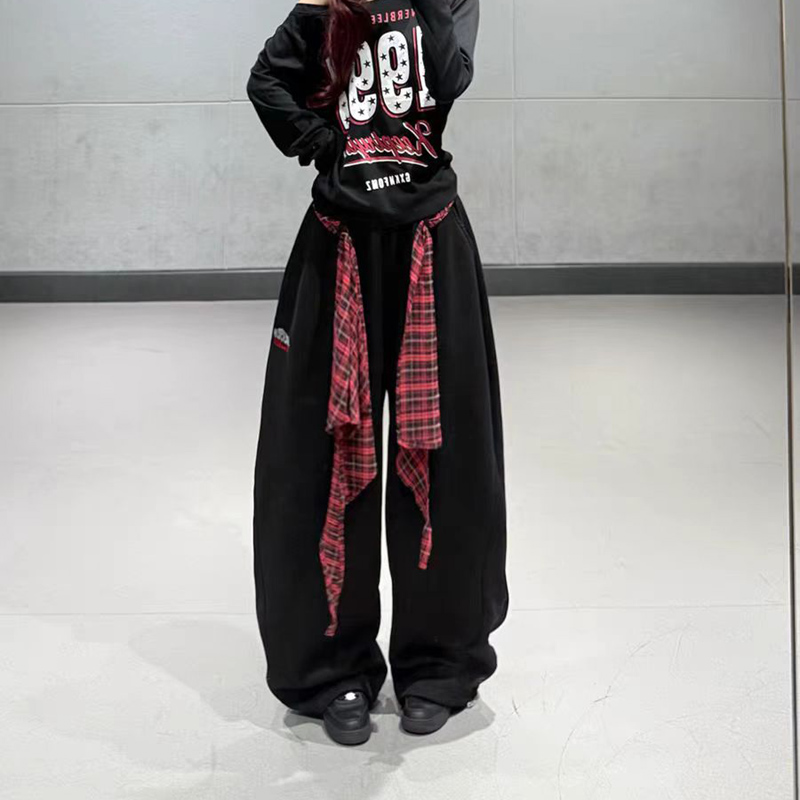 YF6412-(2色入内)原宿风格子飘带系腰个性阔腿运动休闲卫衣裤 嘻哈风长裤