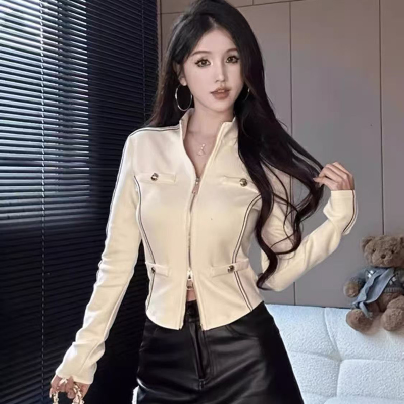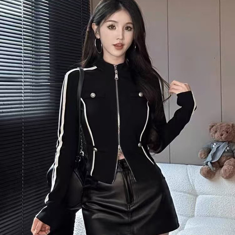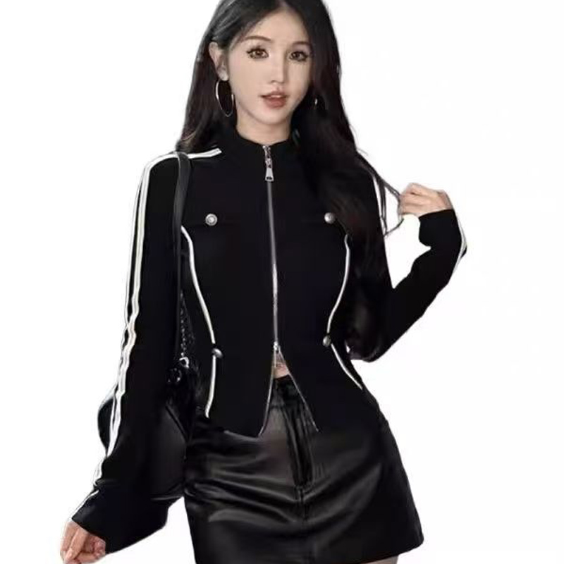 YF6413-(2色入内)秋冬时尚机车气质长袖双拉链撞色弧边排扣辣妹显瘦短装上衣