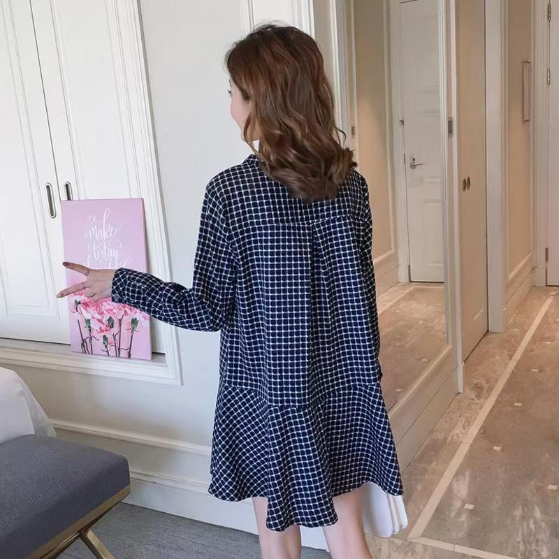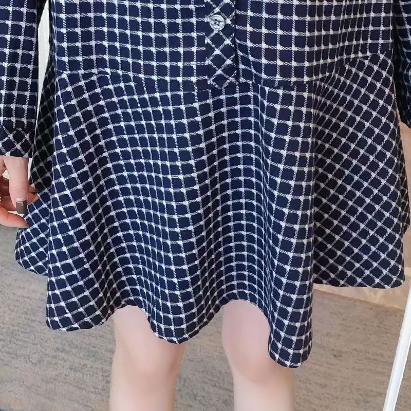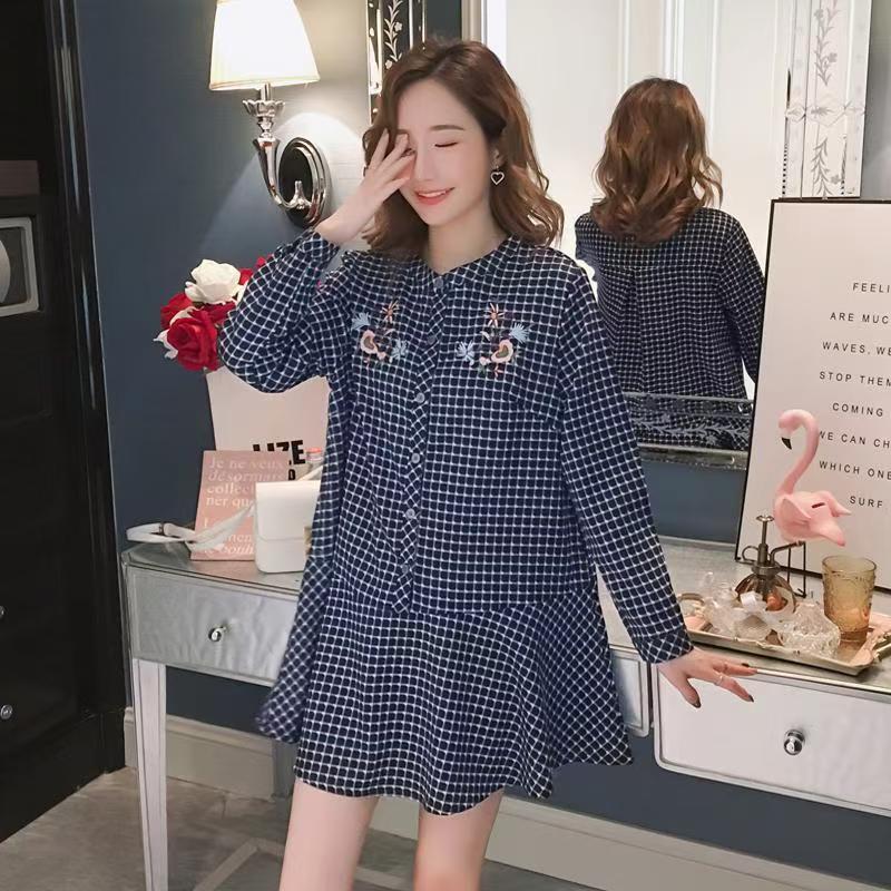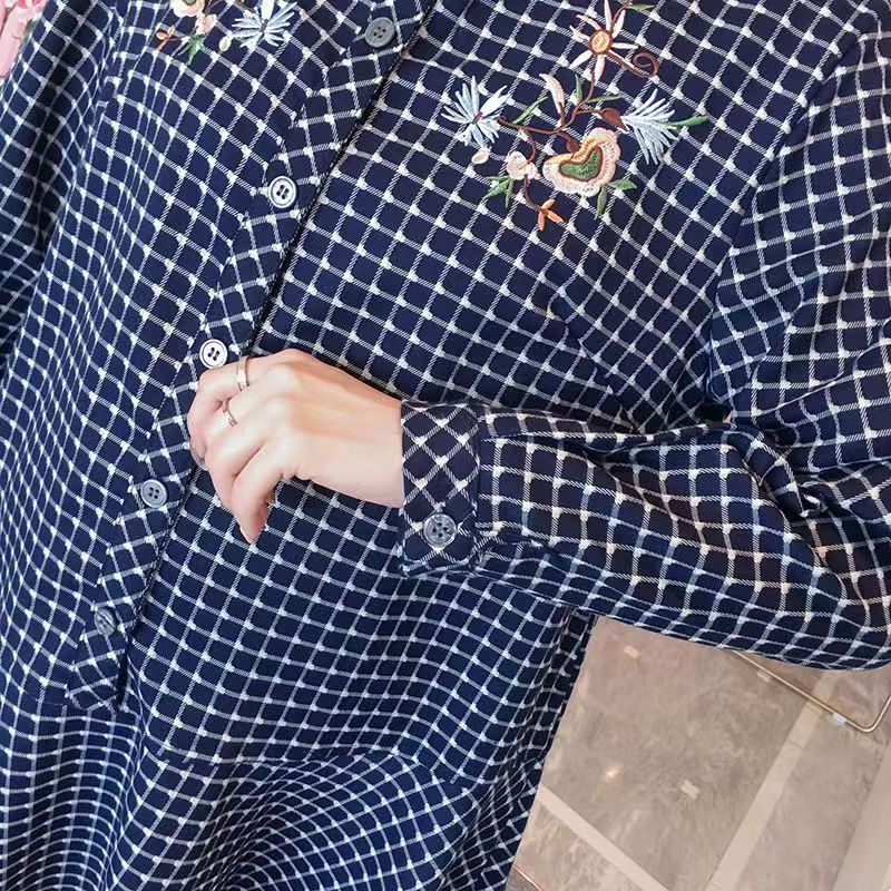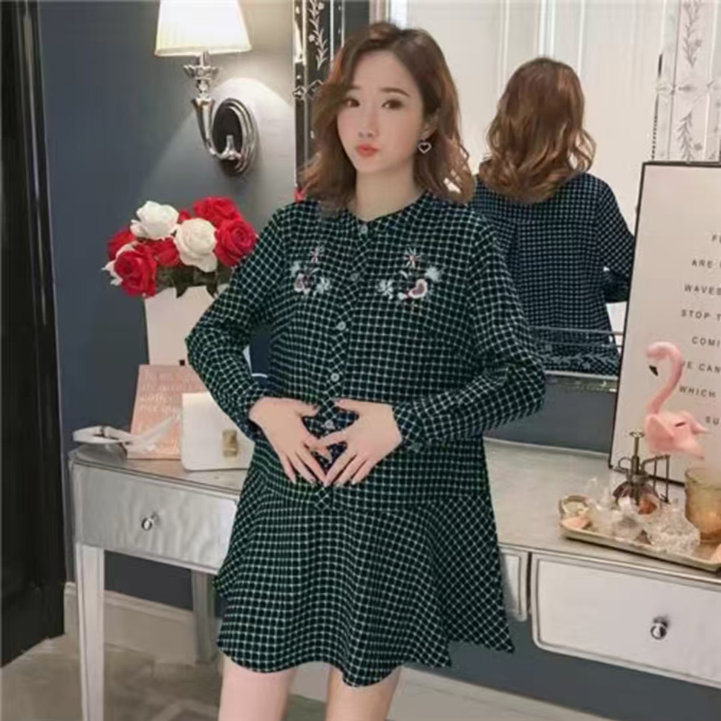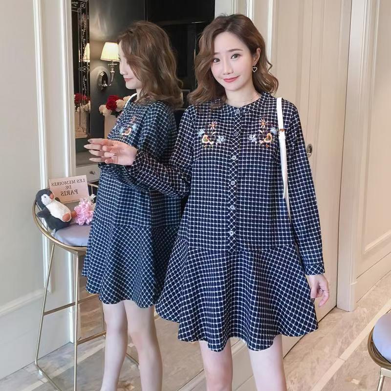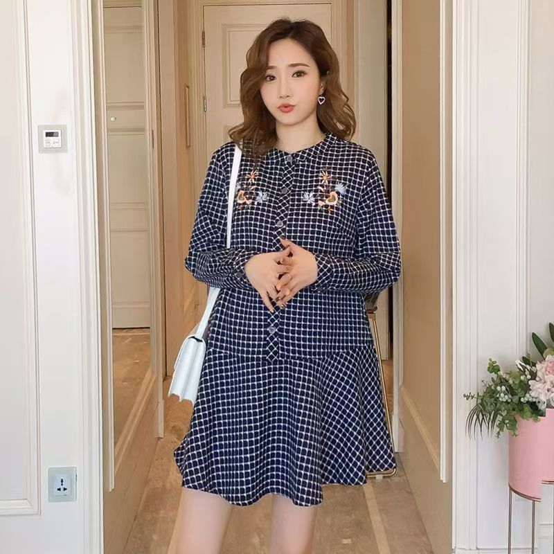 YF6417-(2色入内)新款复古格子刺绣碎花长袖套头系扣胖MM显瘦宽松A字裙
