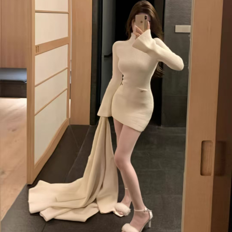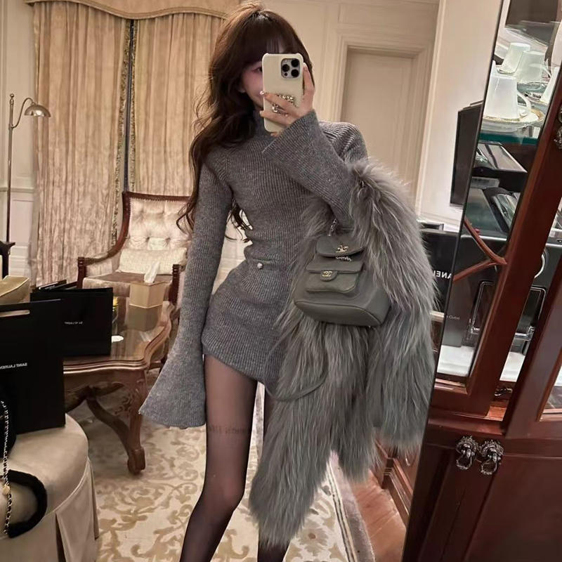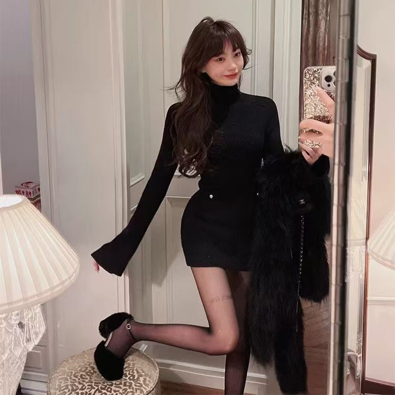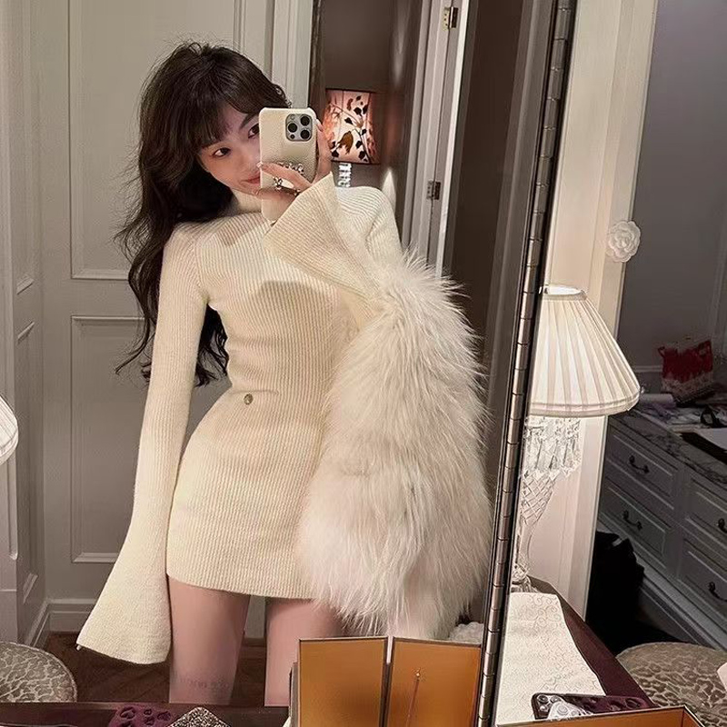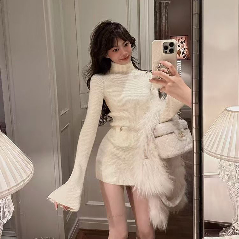 YF6422-(3色入内)韩版针织冬装新款微喇叭长袖圆领套头弹力修身包臀毛衣