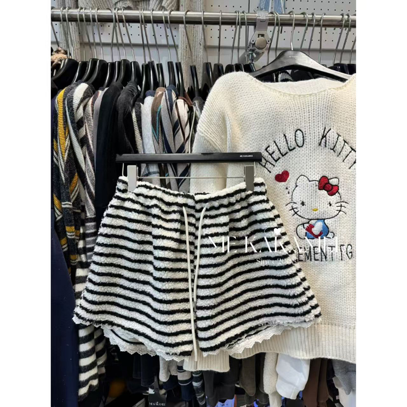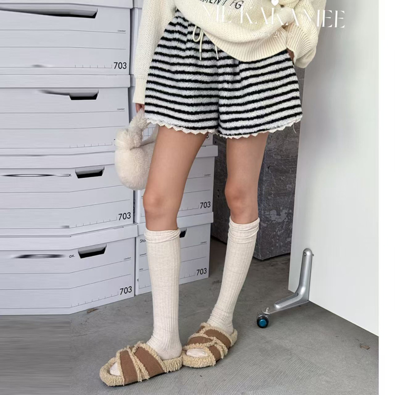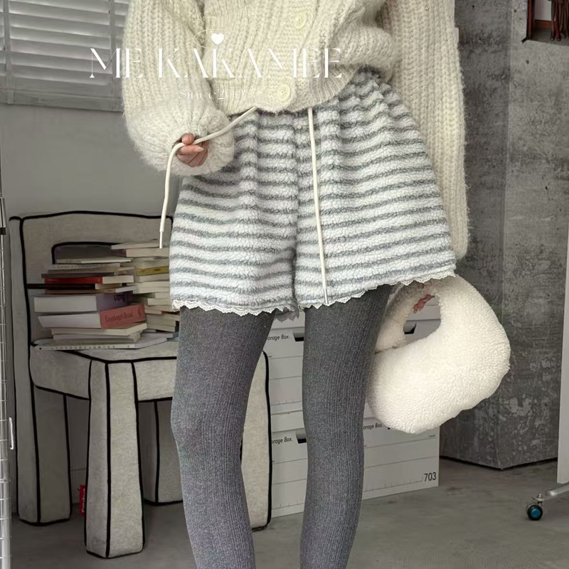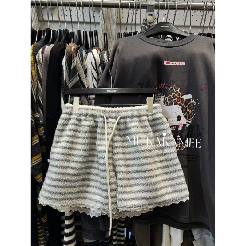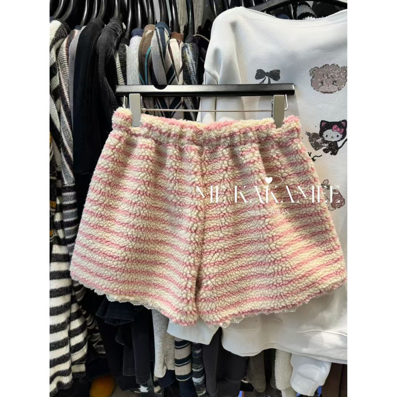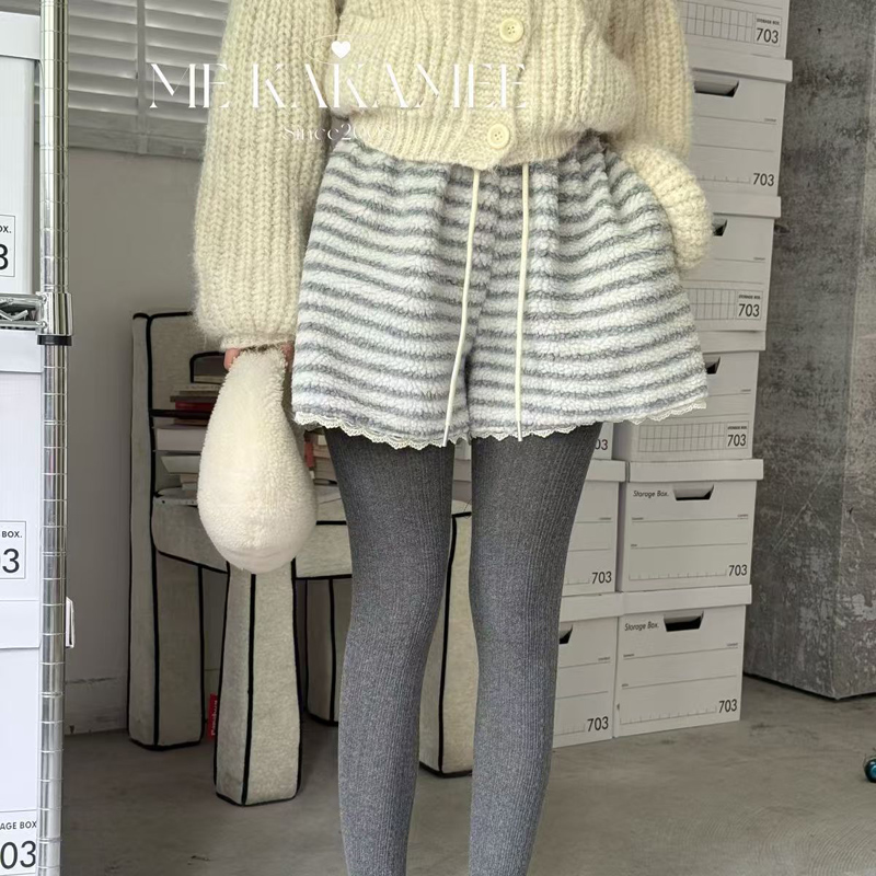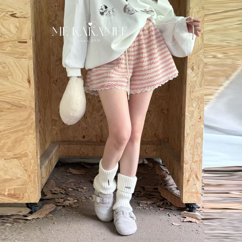 YF6426-(2色入内)辣妹秋冬小可爱松紧腰绑绳条纹拼接蕾丝羊羔绒韩版短裤