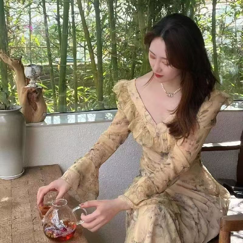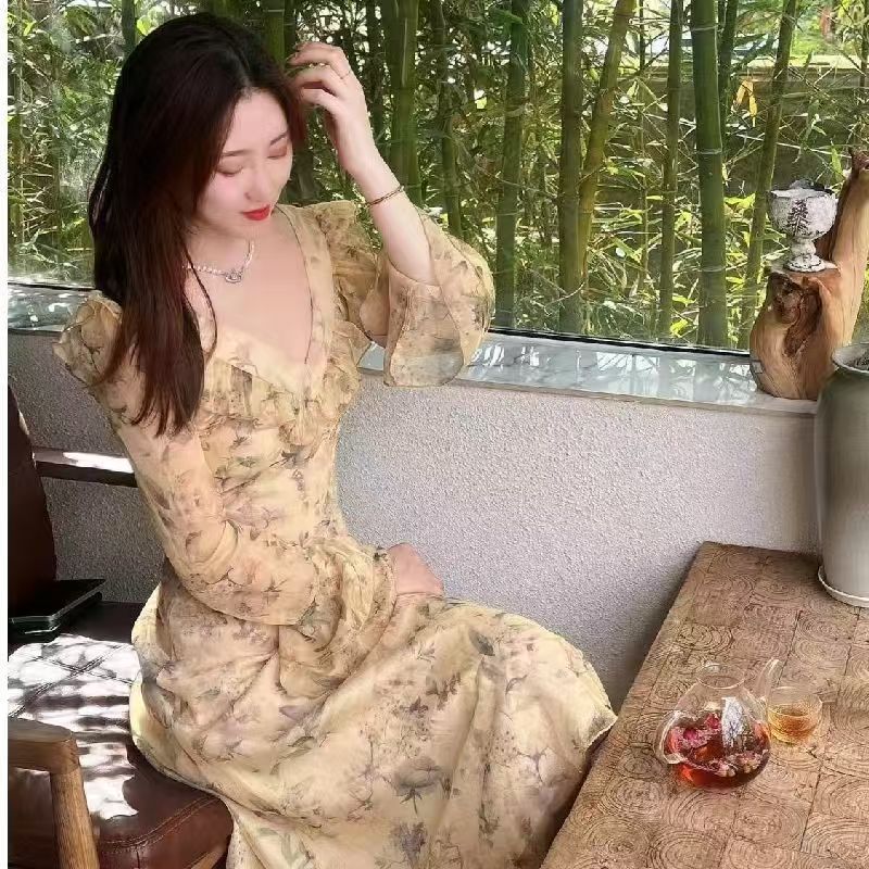 YF6429-图片色韩版优雅时尚碎花新款套头长袖收腰坠地感梨型雪纺连衣裙