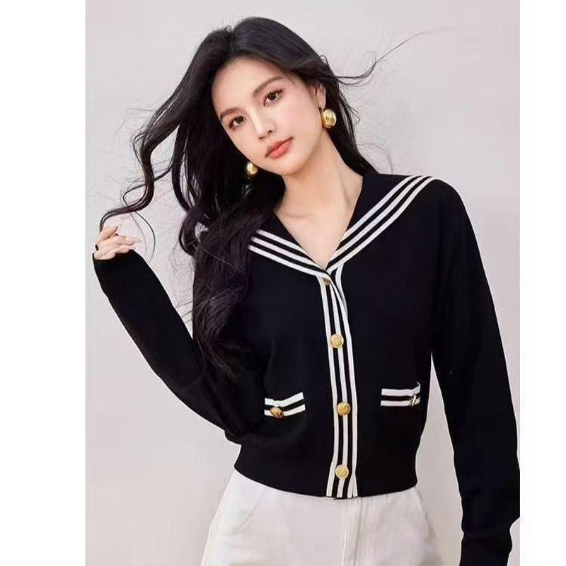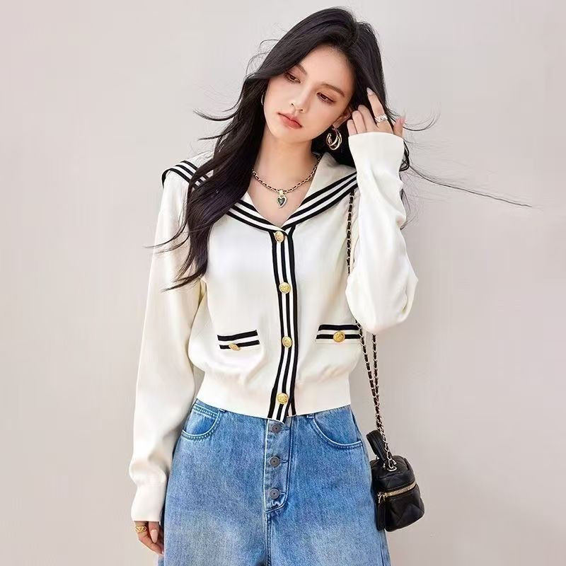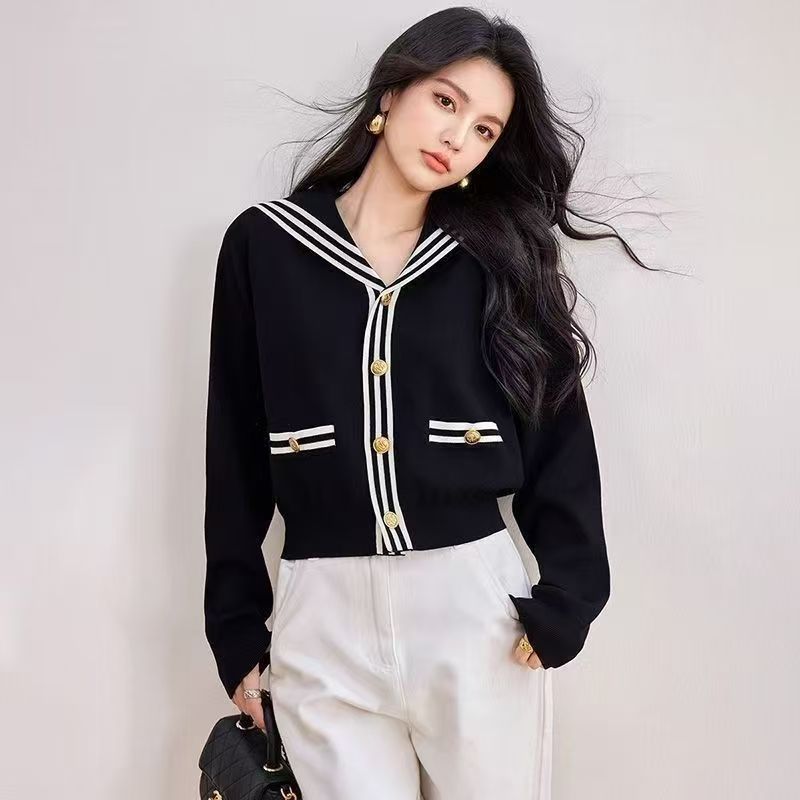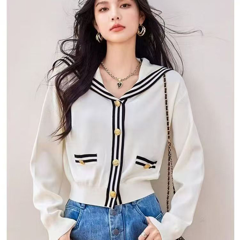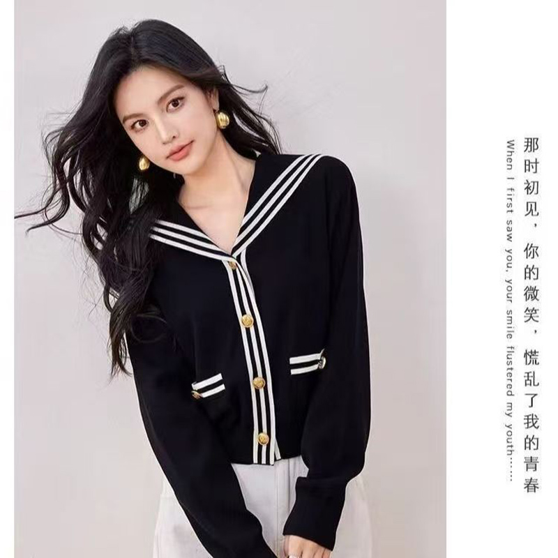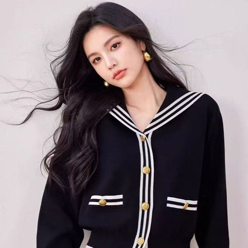 YF6431-(2色入内)小可爱海军风撞色条纹系扣束腰显瘦减龄冬季保暖针织上衣
