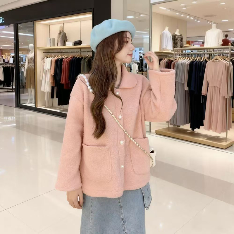 YF6432-(2色入内)冬装保暖羊羔绒加厚加绒长袖娃娃领排扣有口袋设计大码外套
