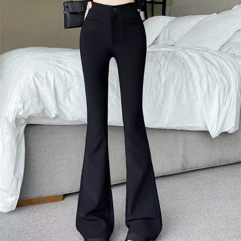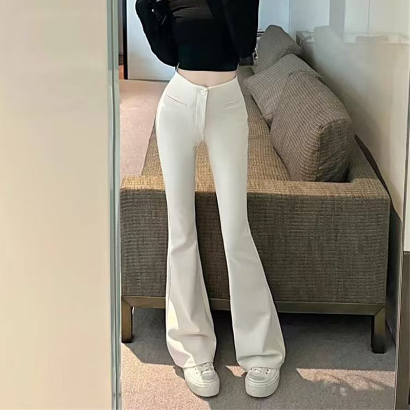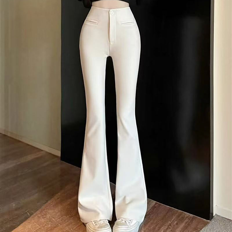 YF6433-(2色入内)韩版时尚新款系扣高腰前插口袋设计微喇叭白色拖地西裤
