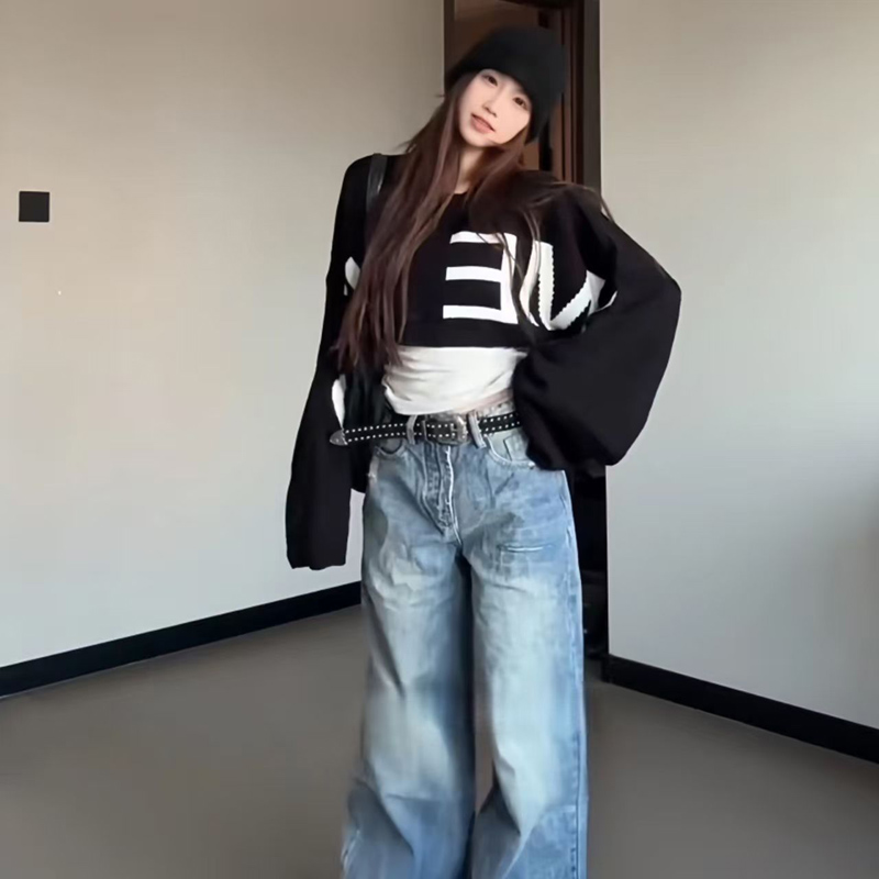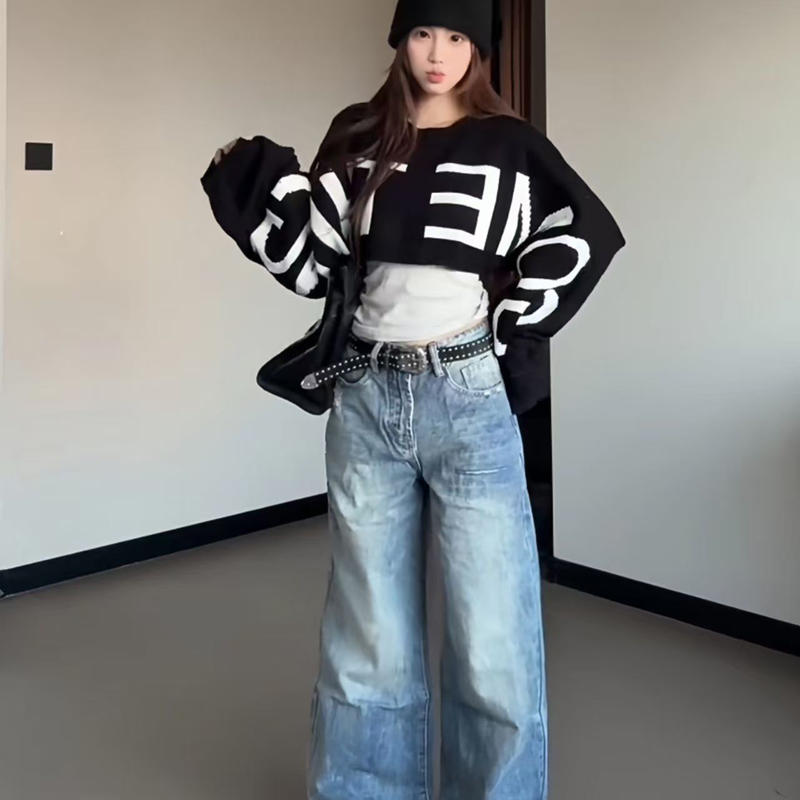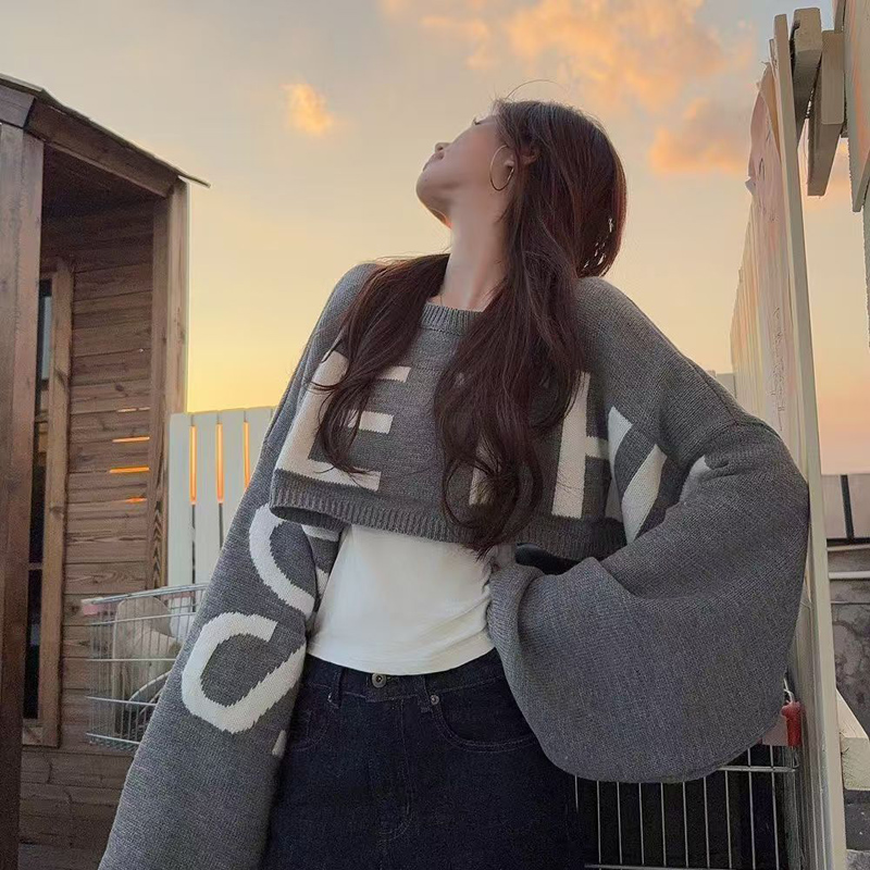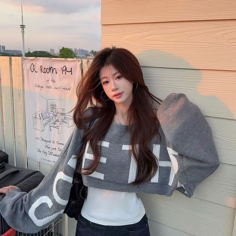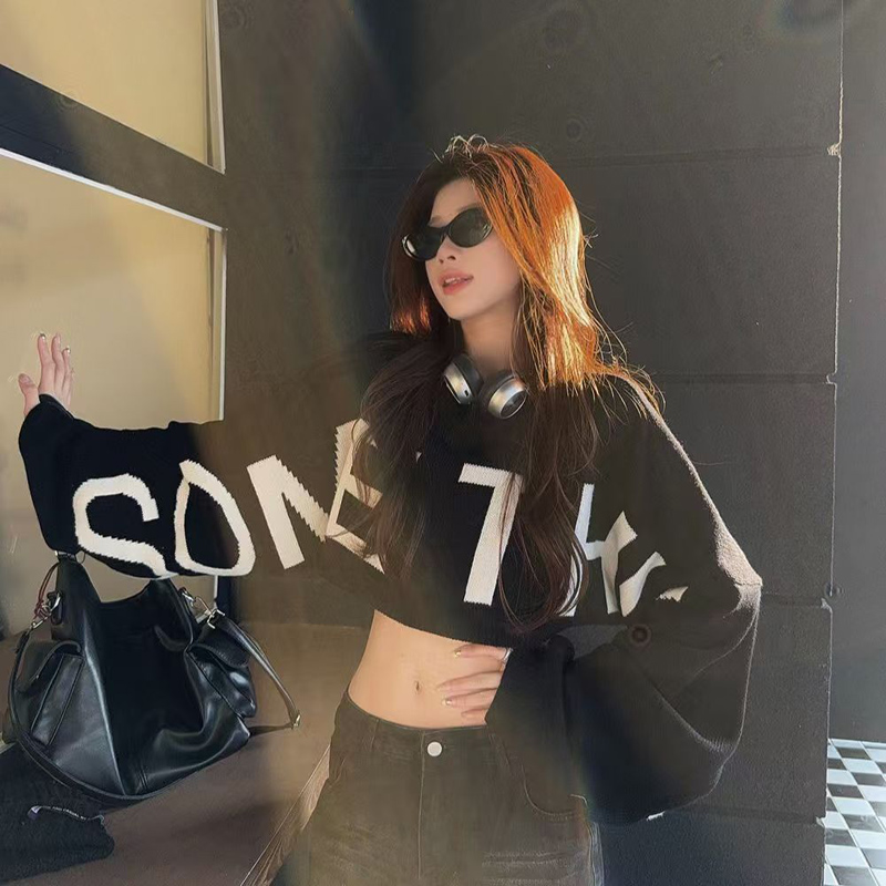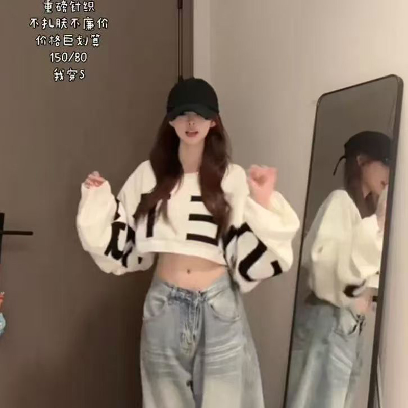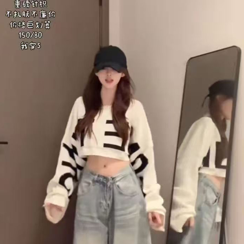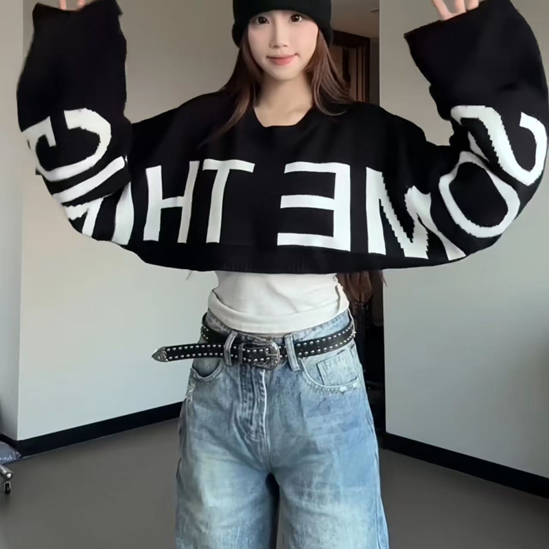 YF6436-(2色入内)辣妹冬装露脐短款字母提花个性设计休闲百搭针织毛衣外套