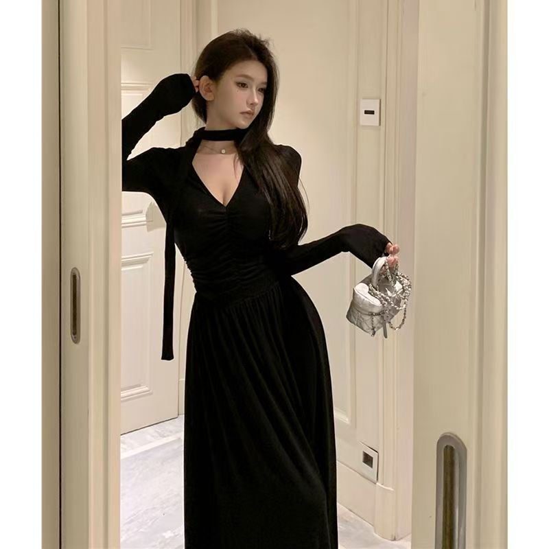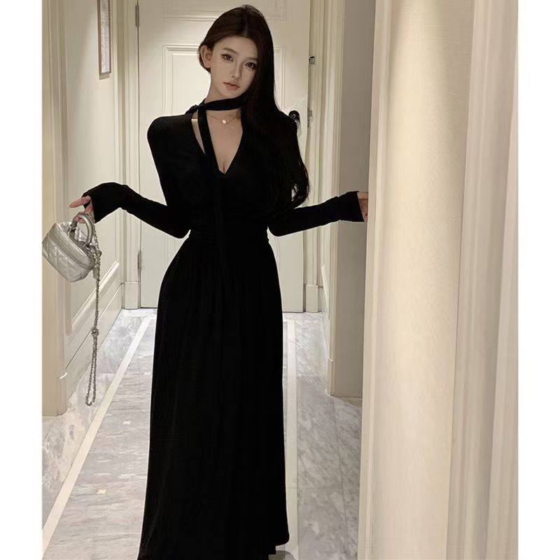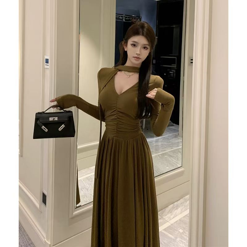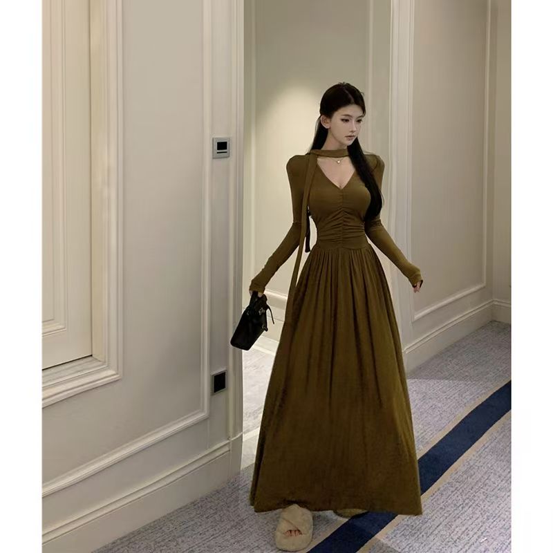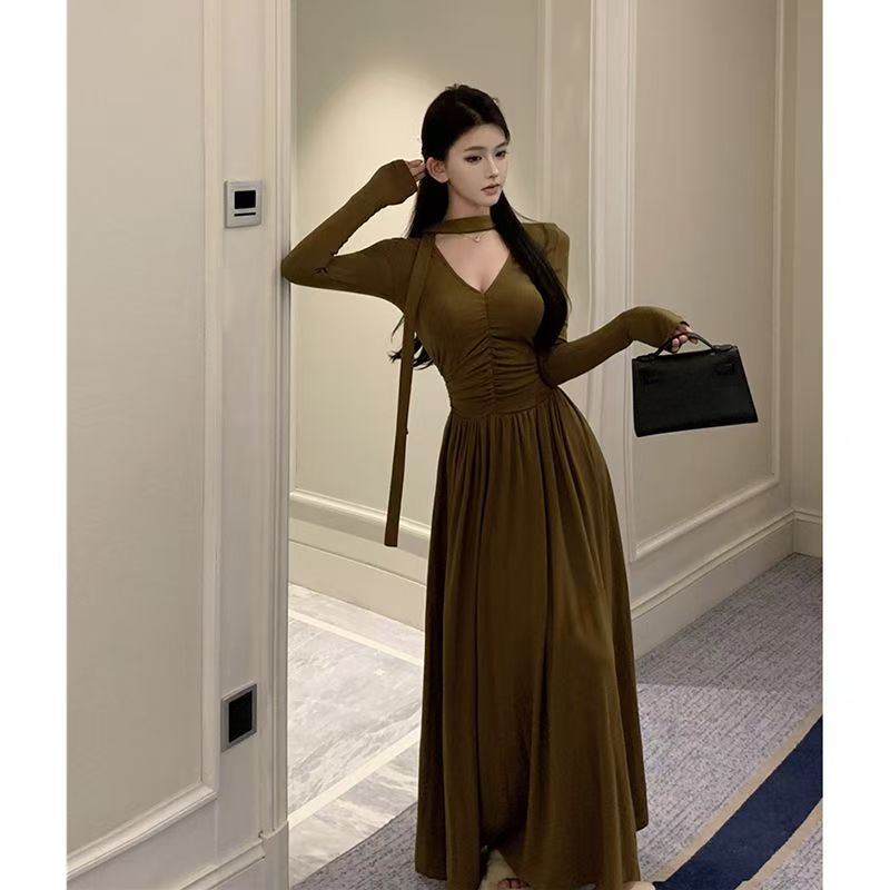 YF6446-(2色入内)复古风飘带设计V领套头褶折修腰小清新韩版秋冬别致连衣裙