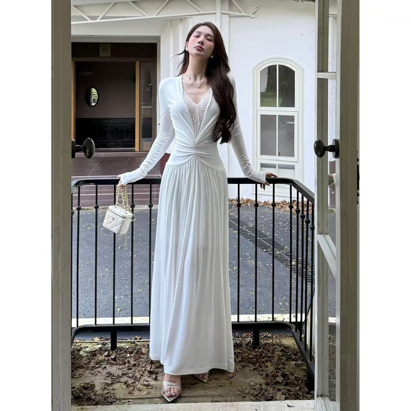 YF6447-(2色入内)名媛风蕾丝拼接镂空拼接弹力修身中长款复古风法式连衣裙