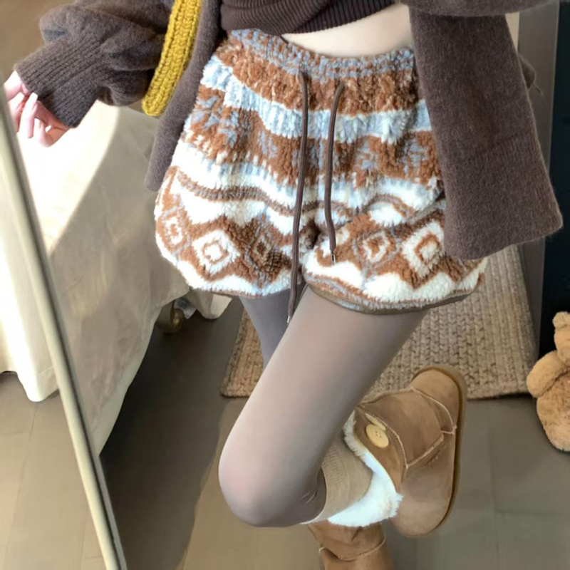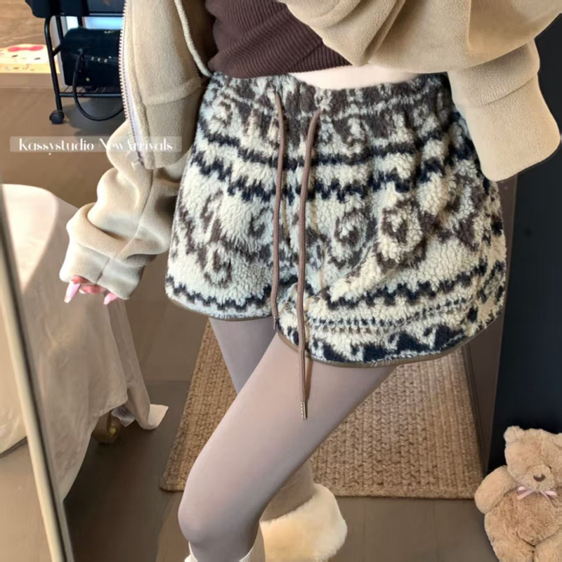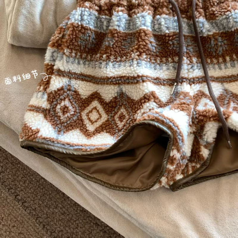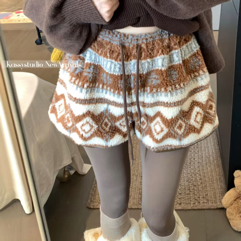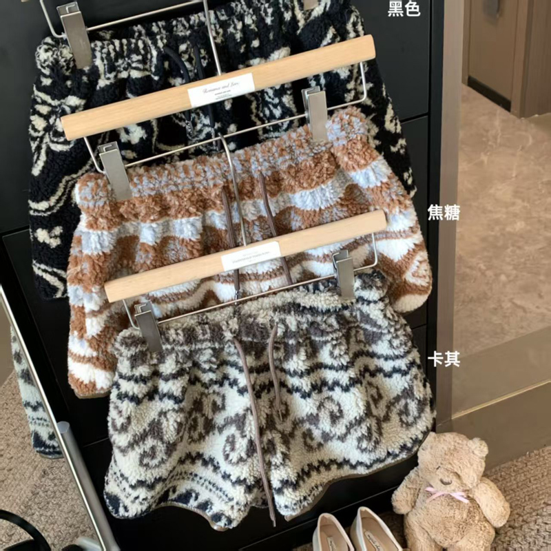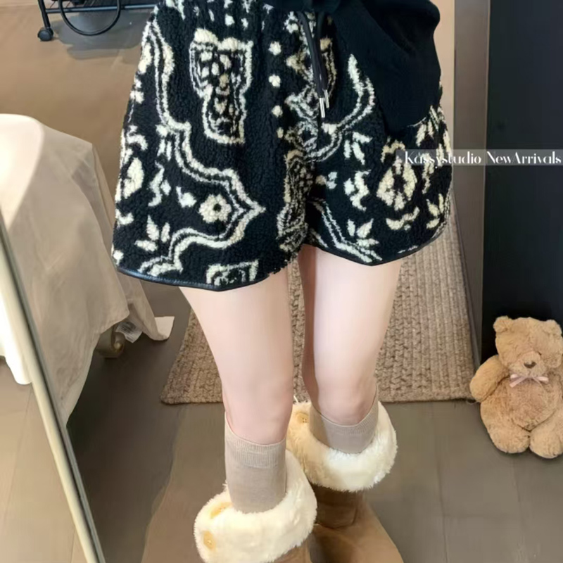 YF6449-(3色入内)冬季辣妹新款加绒不规则提花图腾设计松紧腰抽绳阔腿短裤