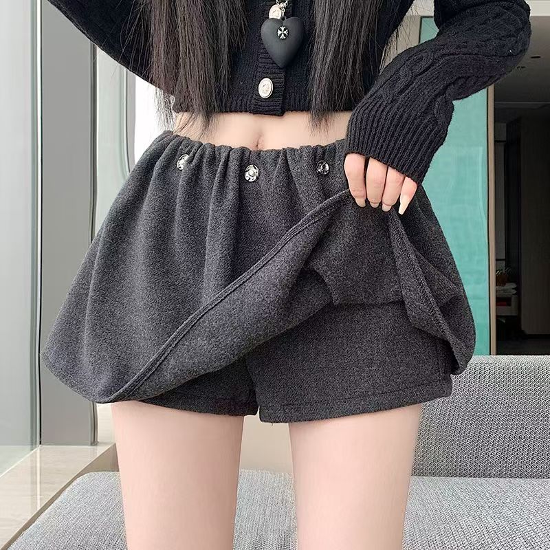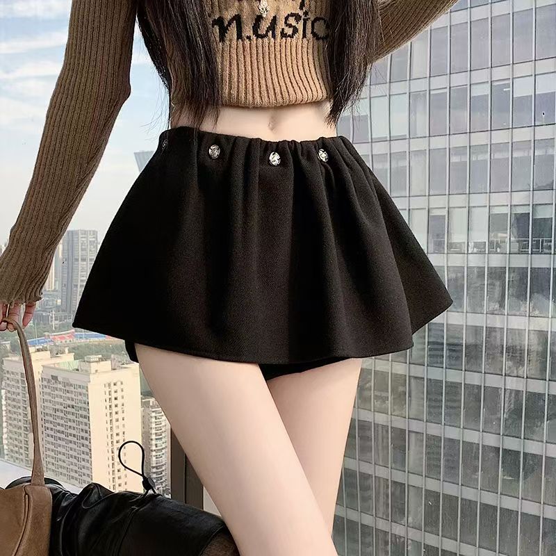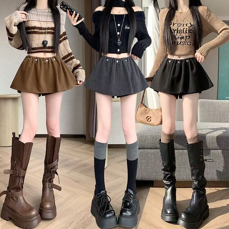 YF6451-(3色入内)冬装钉珠褶折低腰A字毛呢加厚保暖假两件拼接蓬蓬裙裤