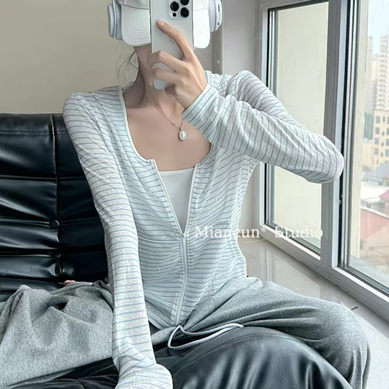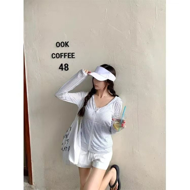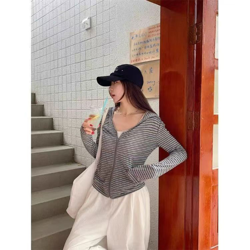 YF6452-(2色入内)学院风韩版长袖连帽拉链条纹显瘦简约百搭秋冬上衣